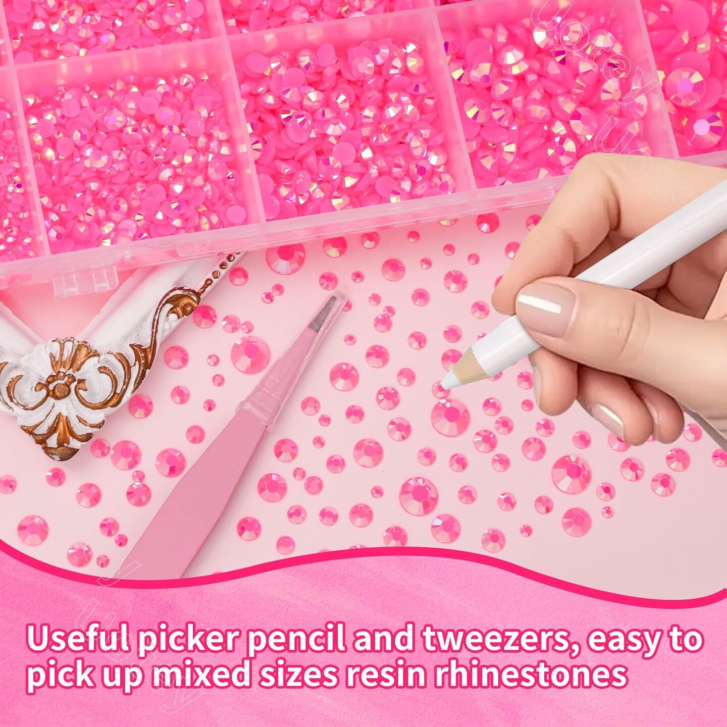 16000 Pcs Flat Back Resin Rhinestones with Pickup Tool - Hot Pink (Mixed Sizes)