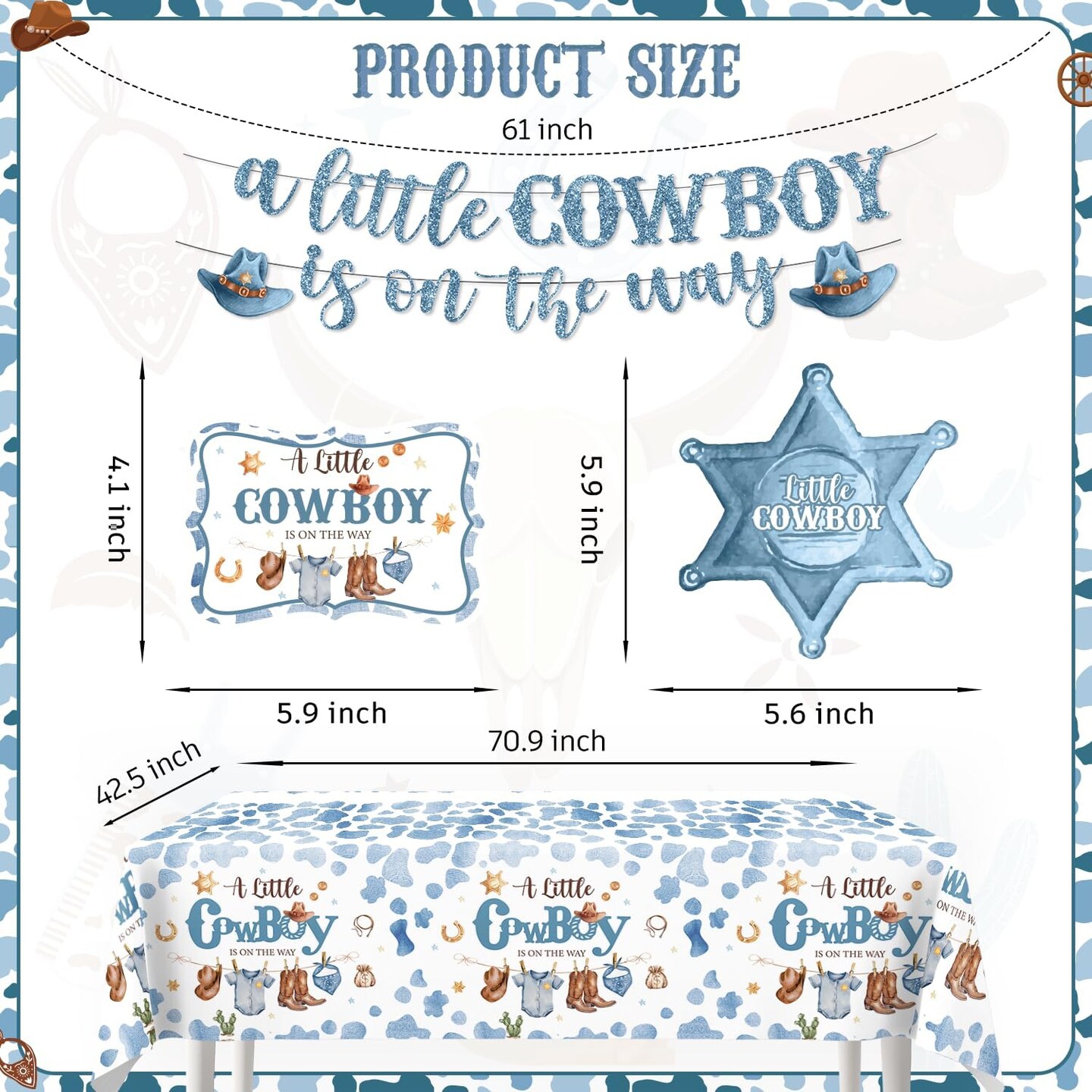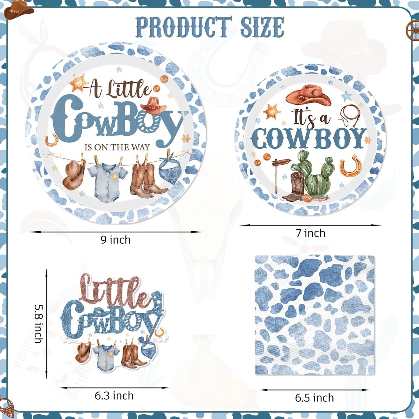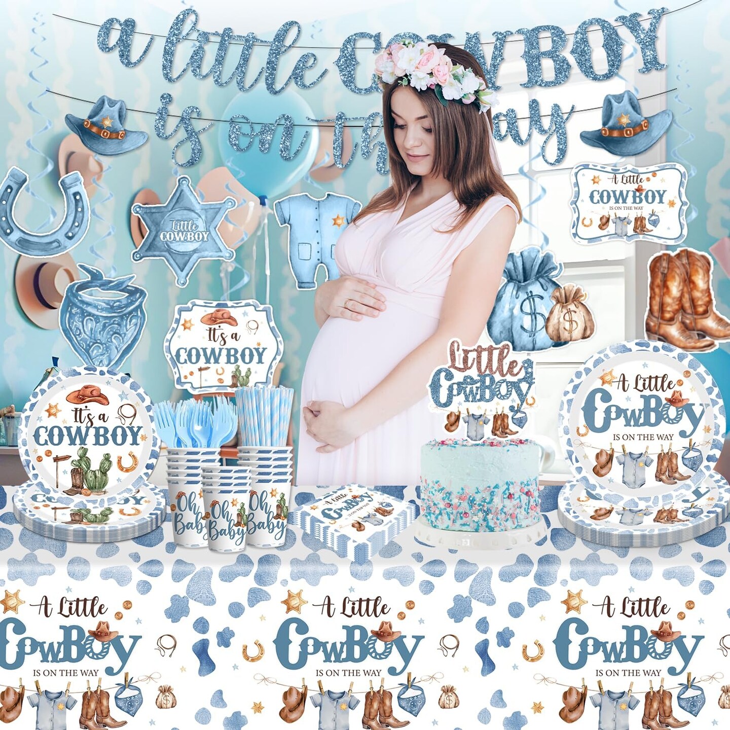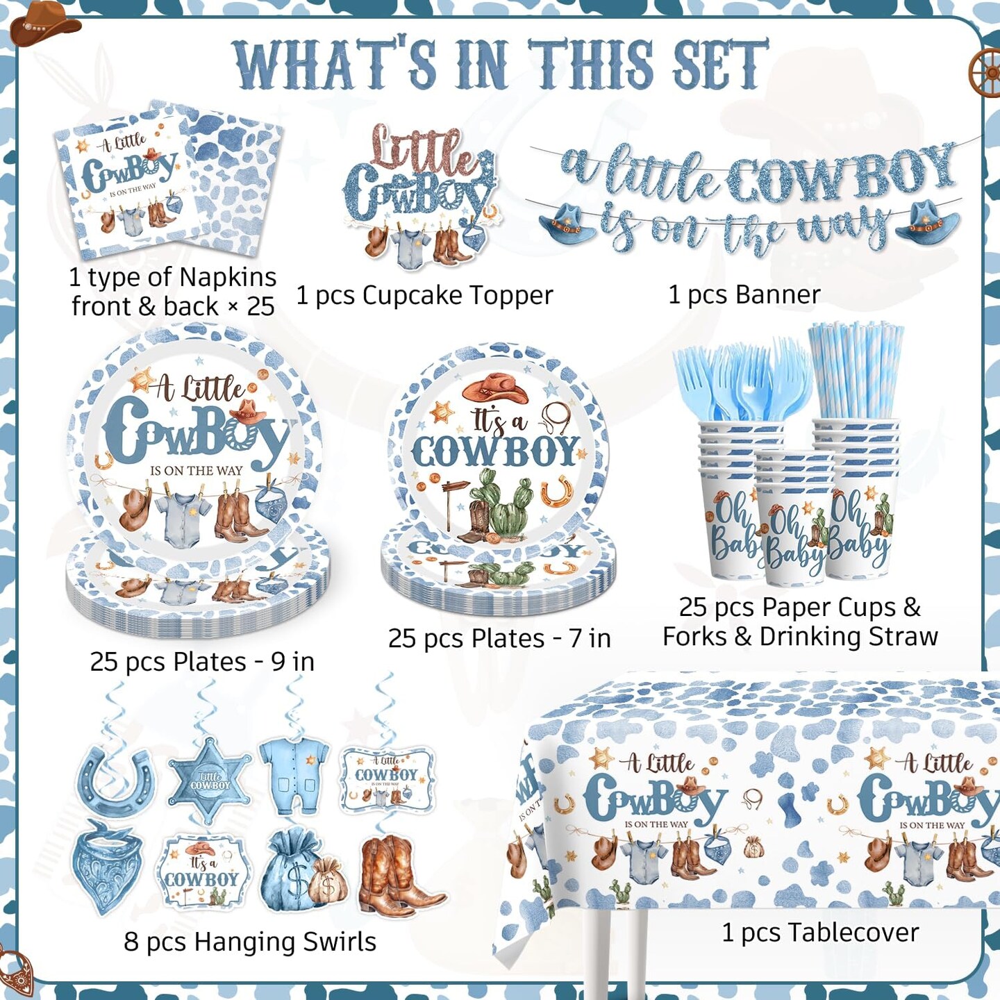 161pc Cowboy Baby Shower Party Set – Serves 25, with Plates, Napkins, Tablecloth & Cake Topper (Blue)