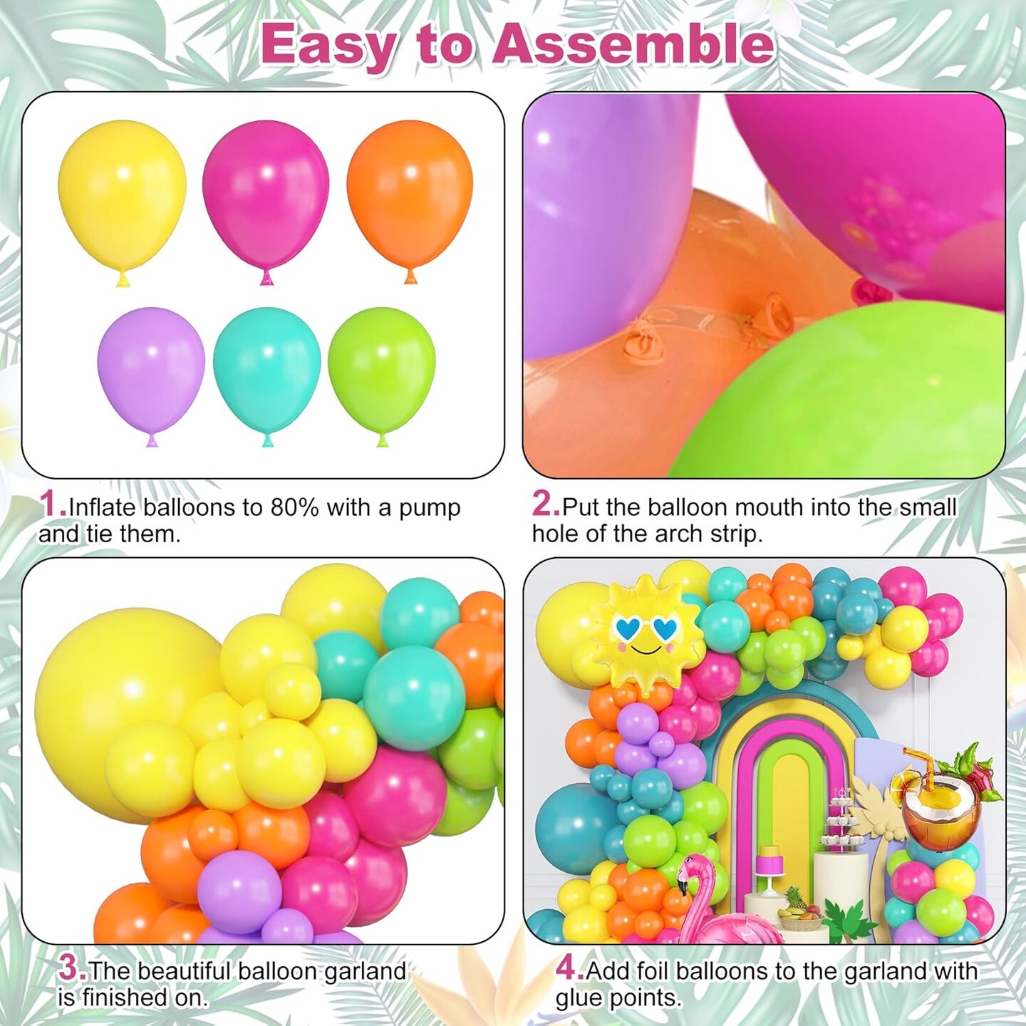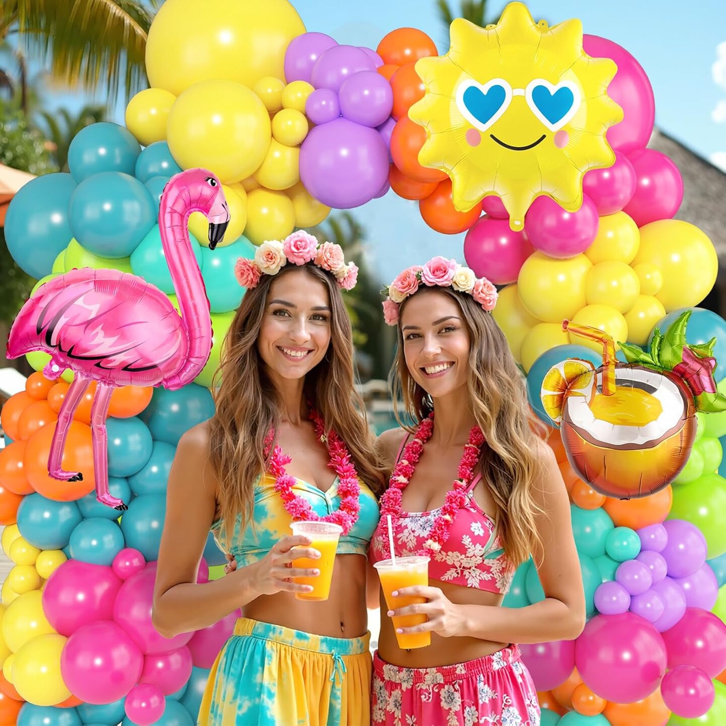 164pcs Summer Tropical Balloon Arch Garland Kit – Rainbow Hot Pink, Green, Orange, Blue & Purple Balloons with Sun, Coconut & Flamingo Foils for Hawaiian Luau, Aloha, Baby Shower & Birthday Party Decorations