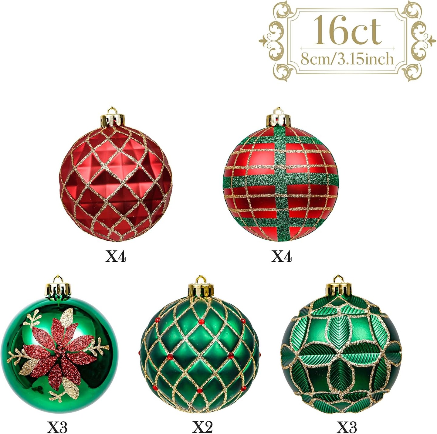 16ct Christmas Ball Ornaments Set, Red Green and Gold Shatterproof Hanging Decorations for Trees, 3.15 Inches