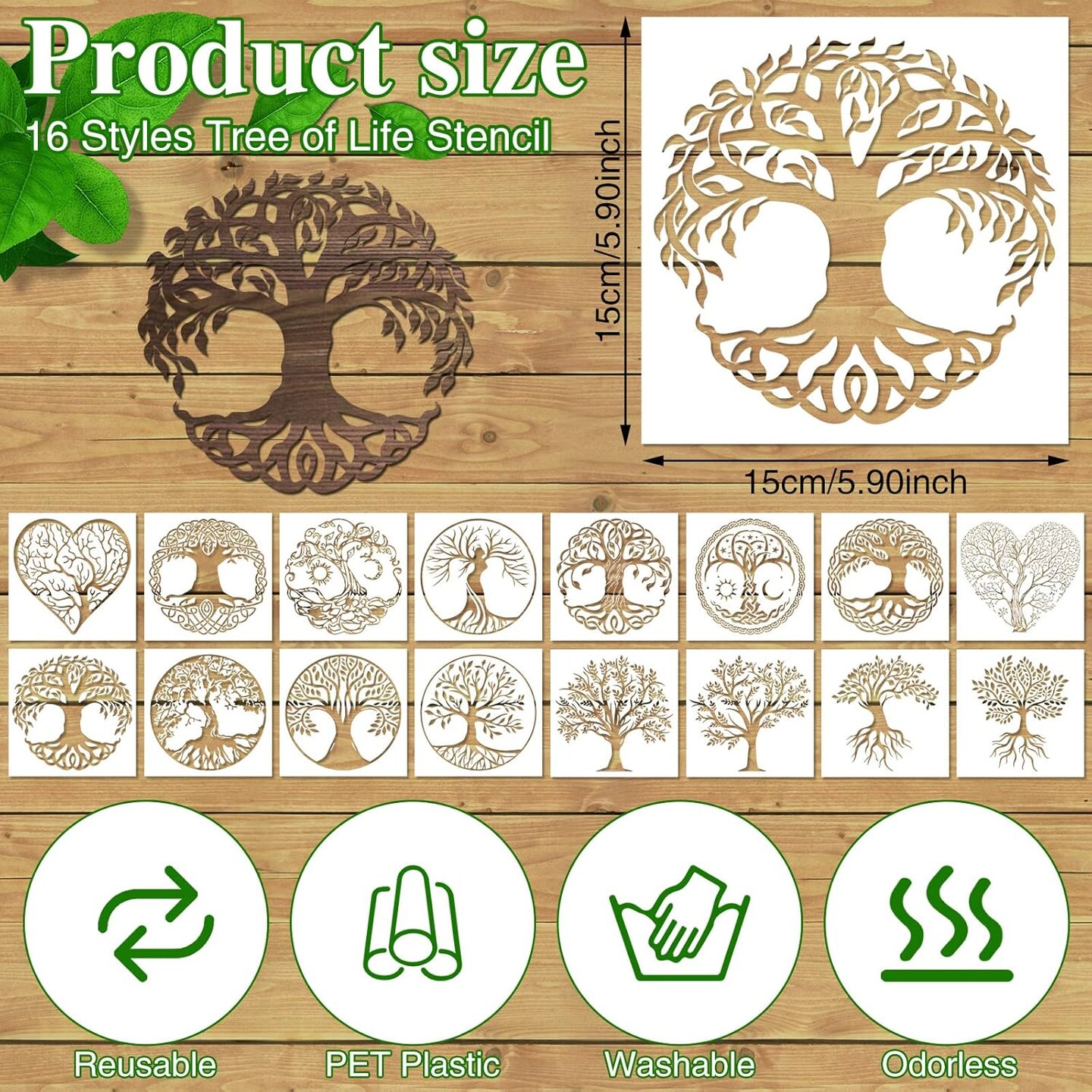 16PCS Tree of Life Painting Stencils Set – 6×6 Inch Reusable Layering Templates for Wood, Wall, Window, Floor, Scrapbooking, Card Making & DIY Art Decor