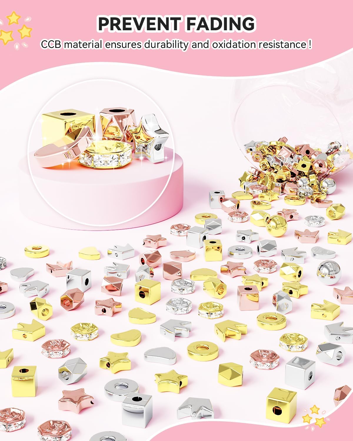 1740 Pieces Gold Beads for Friendship Bracelets Making Kit, 8 Shapes Organized Jewelry Making Supplies Spacer Beads Set with Rhinestones Crafts Gifts