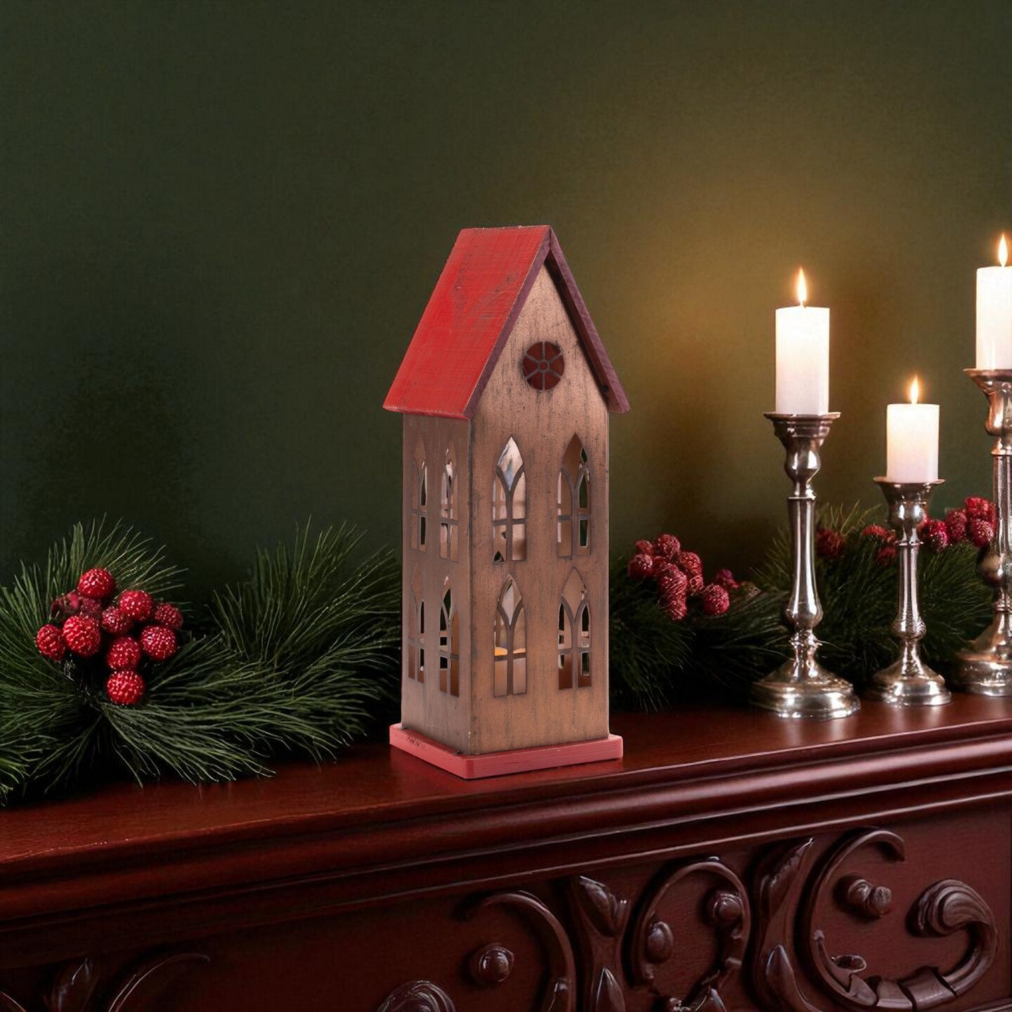 17.5 Inch LED Church Tabletop Decoration Brown Red Farmhouse Holiday Décor