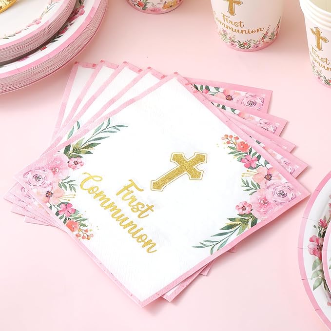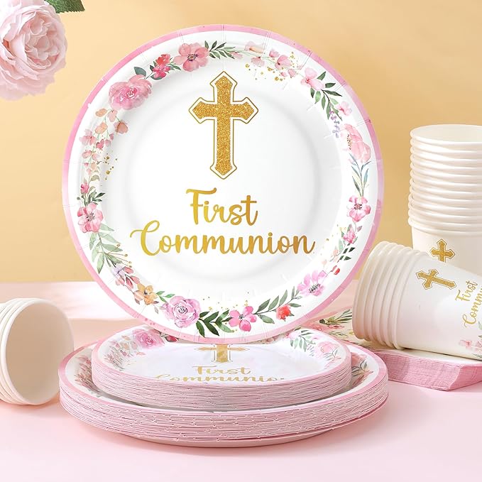 175 PCS First Communion Decorations for Girls - Pink First Communion Paper Plates and Napkins Party Supplies Serves 25 - God Bless Disposable Plate for Baby Shower Baptism Party Decorations