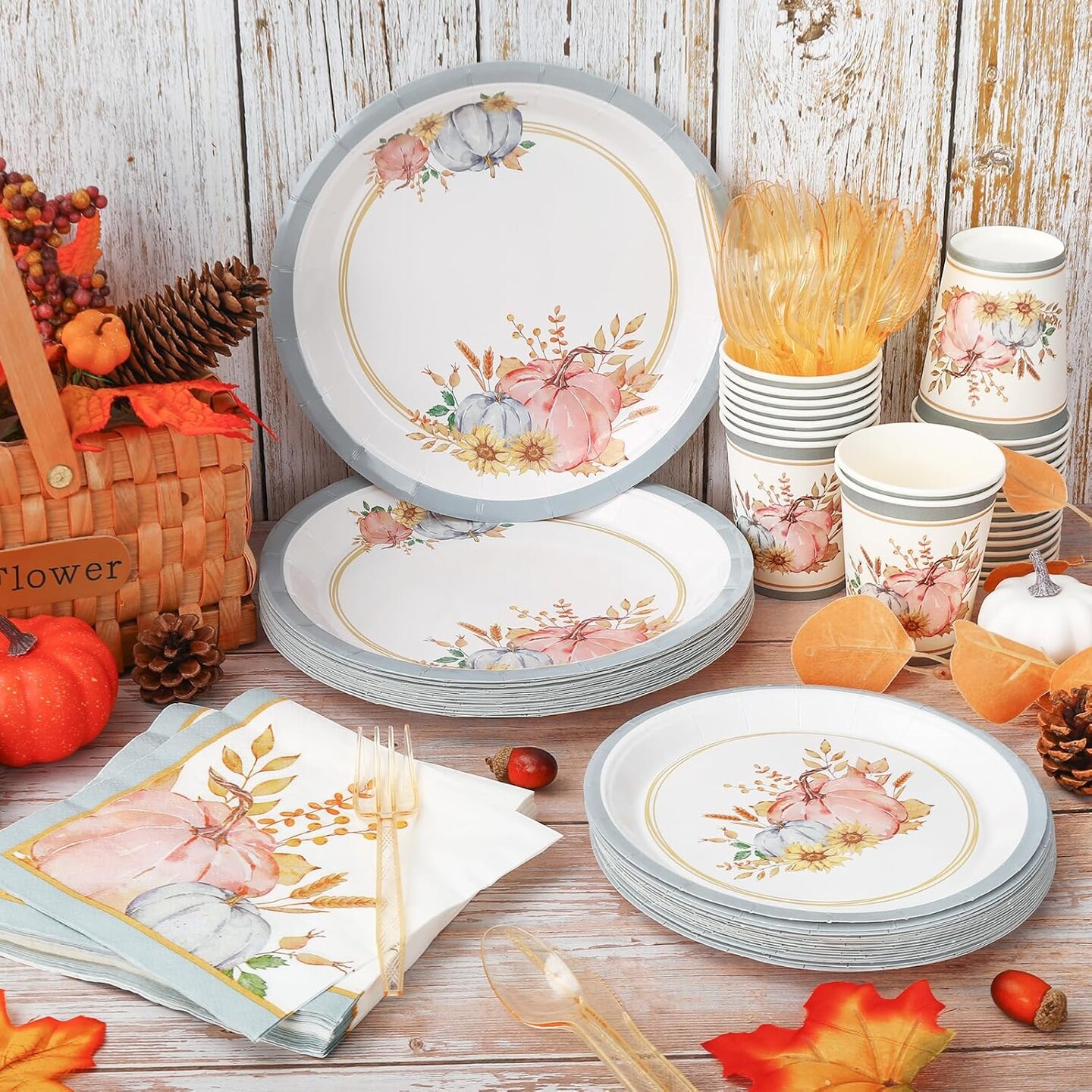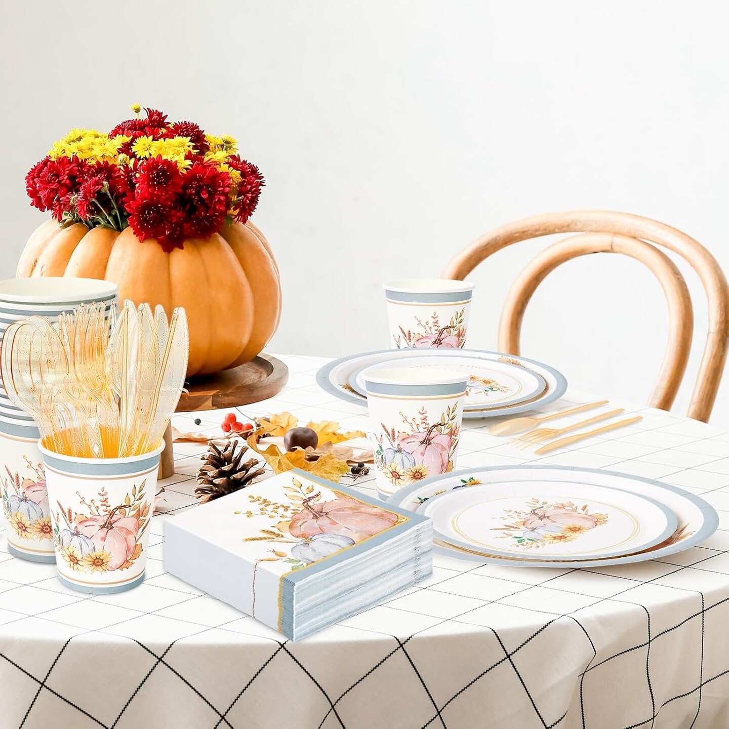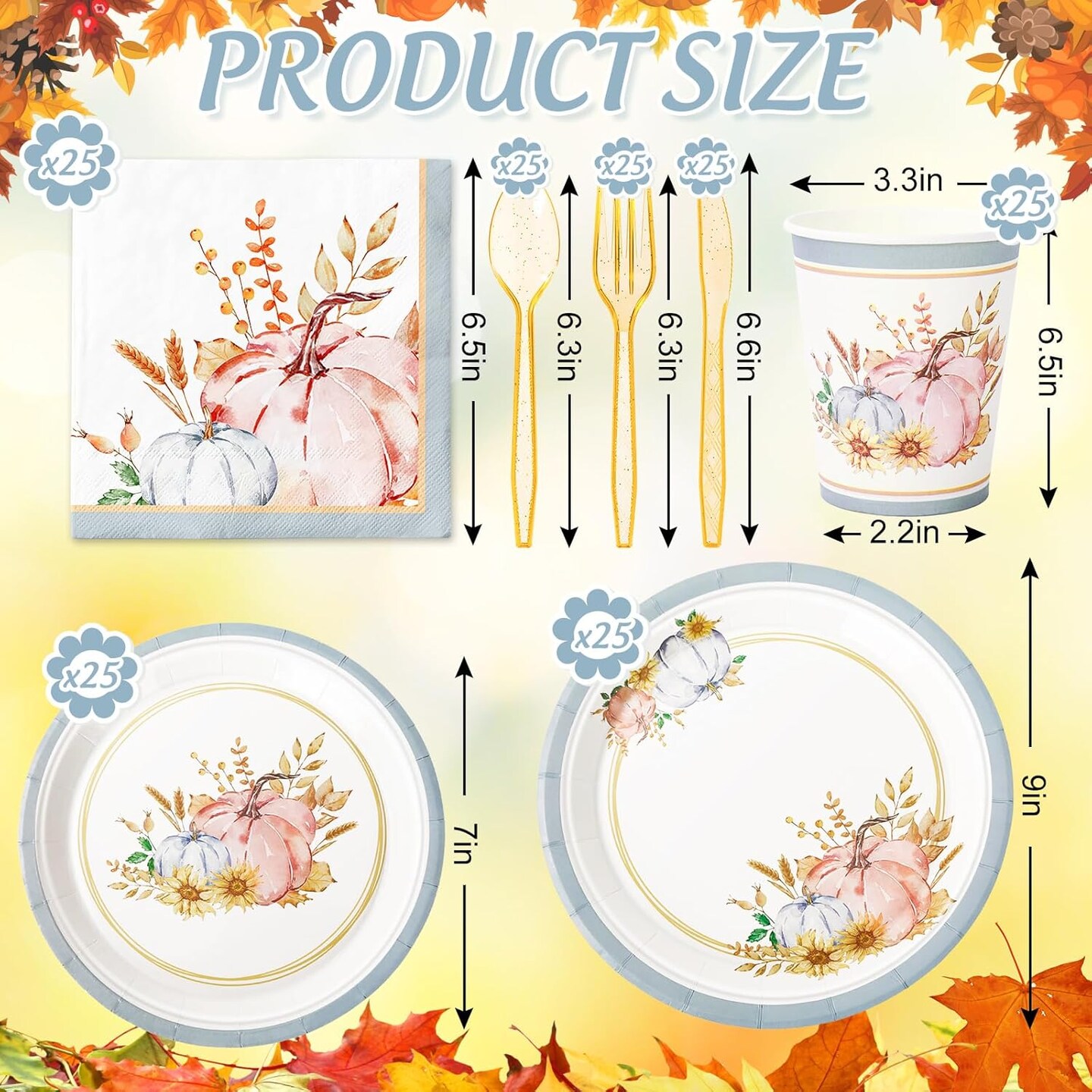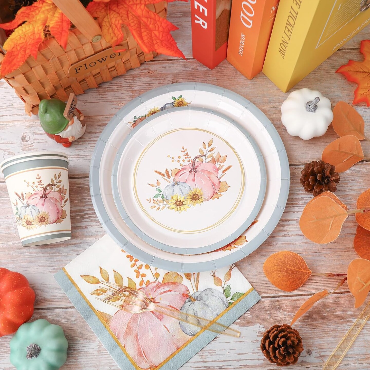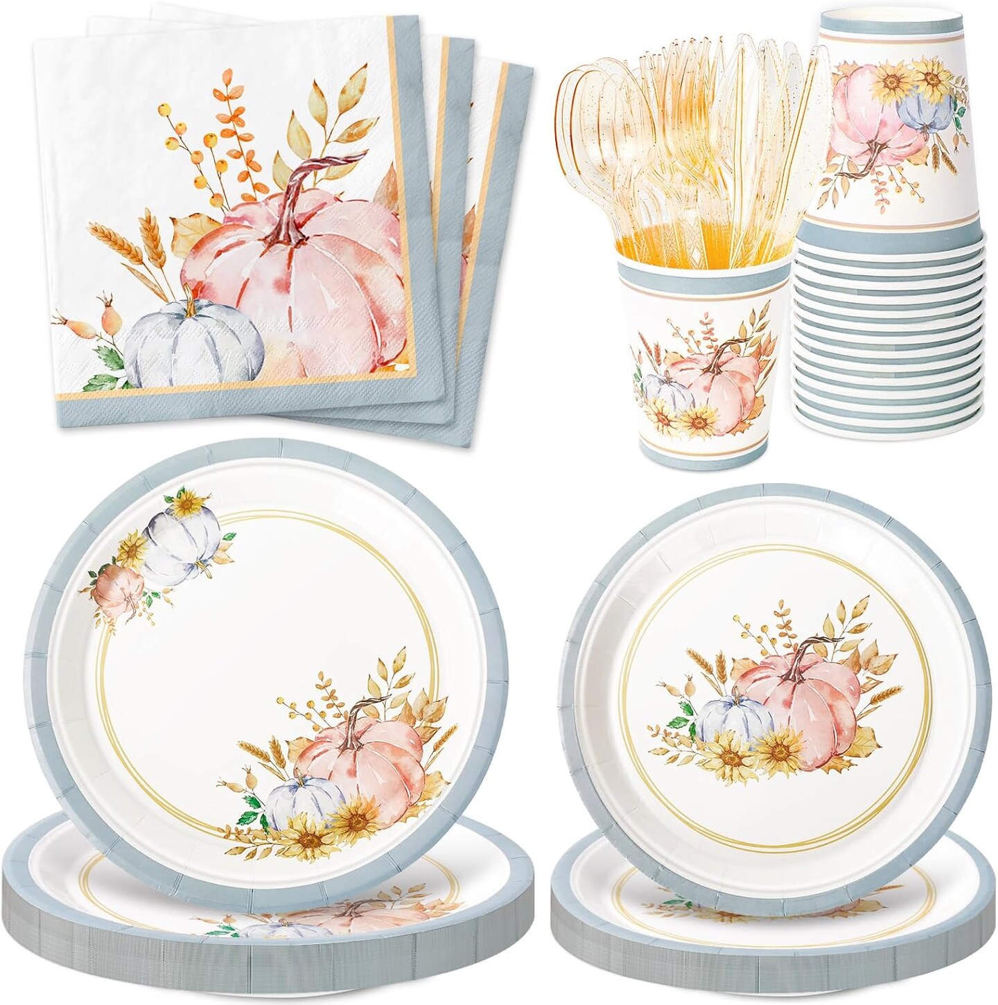 175 Pcs Thanksgiving Pink and Blue Party Supplies - Paper Plates Napkins Cups Cutlery (Serves 25)