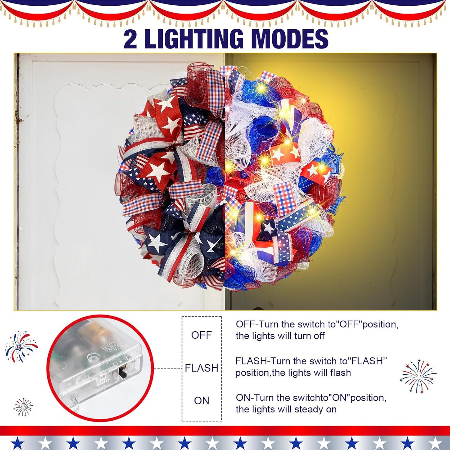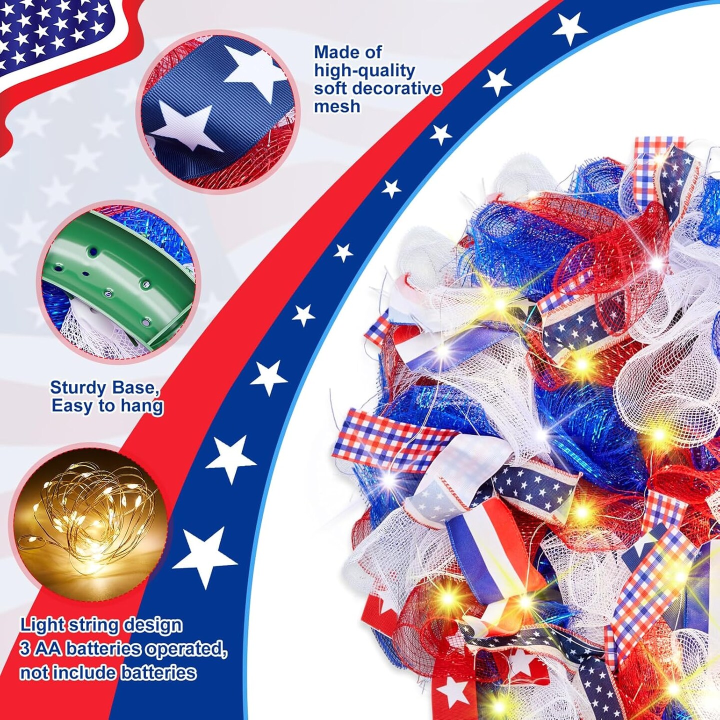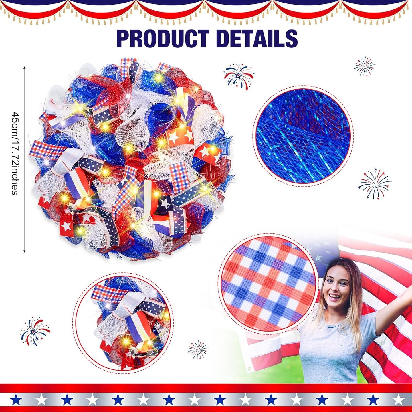 17.72 Inch 4th of July Wreath for Front Door with Light Patriotic Mesh Red White and Blue Wreaths