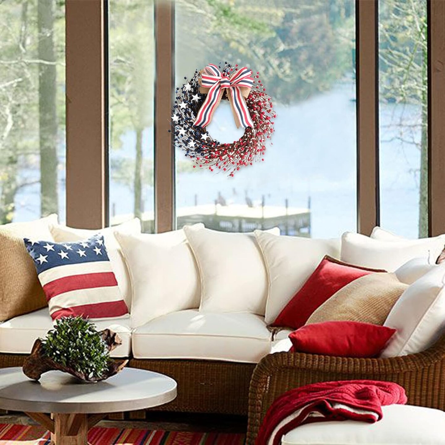18 Inch Patriotic Red White Blue Berries Wreath for Front Door, 4 of July Memorial Day Independence Day Burlap Bow Wreath for Home Decor, American Flag Day Wreath for Indoor and Outdoor Use