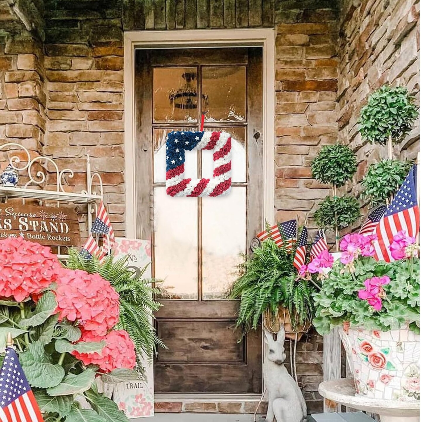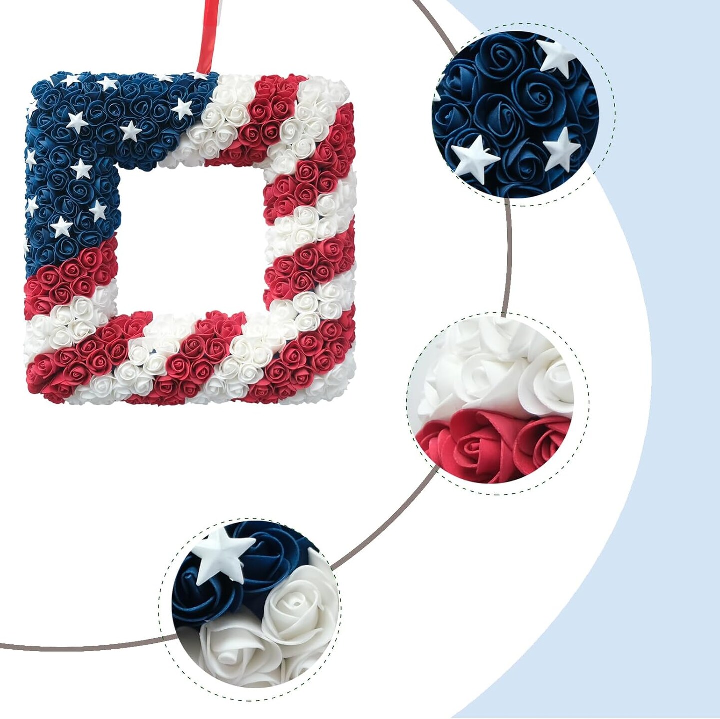 18 Inch Patriotic Red White Blue Large Size Square Shape Flower Wreath for Front Door, Forth of July American Flag Color Soft Touch Floral Wreath for Indoor and Outdoor, July 4th Wreath