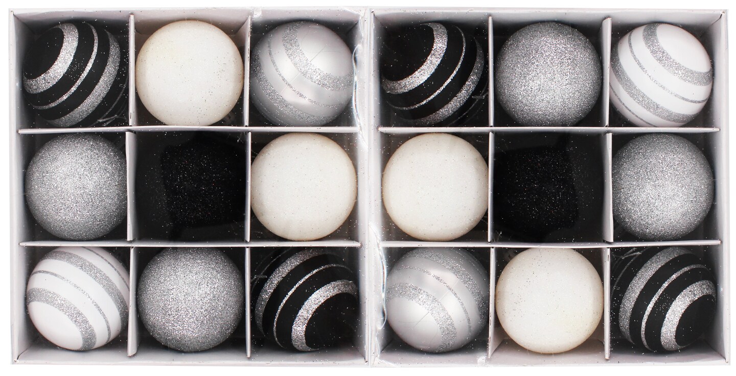 18 Pack of Black, White, and Silver Ball Ornaments with Silver Glitter Enhancement