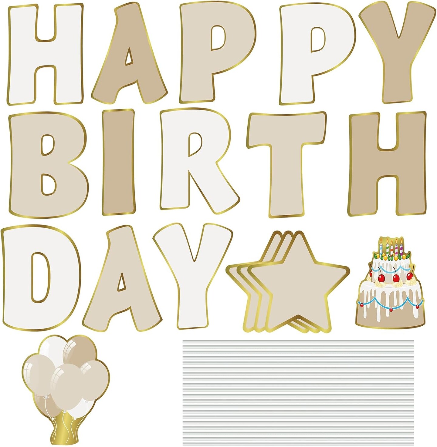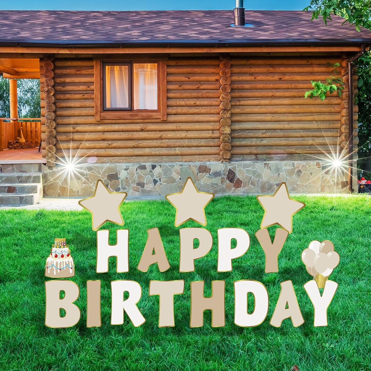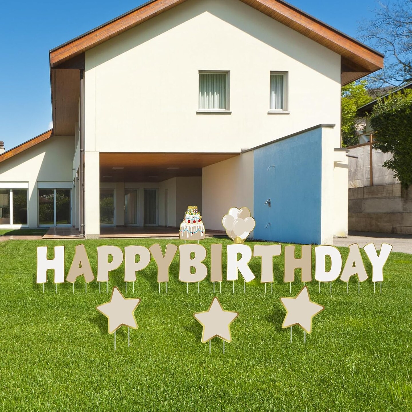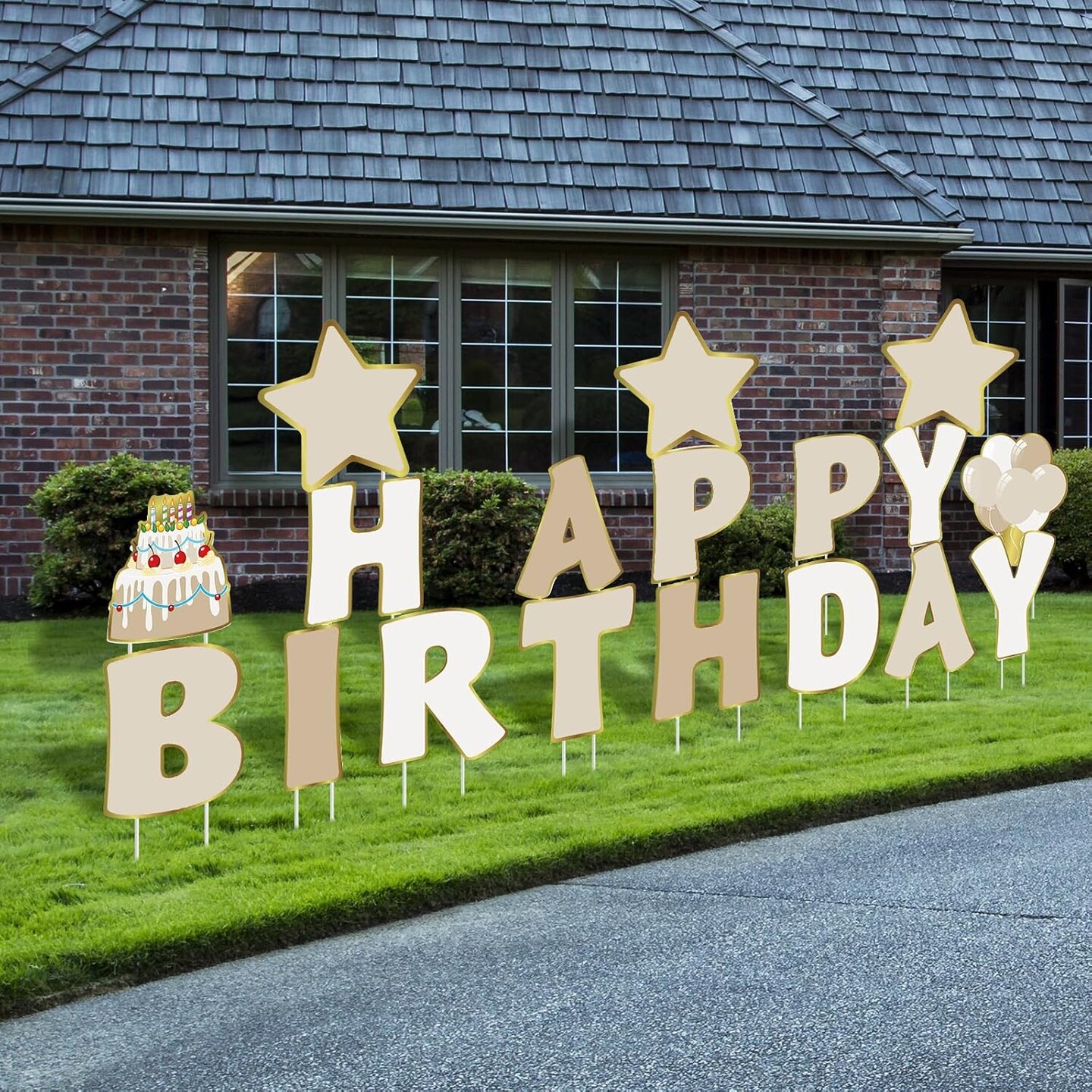 18 Pieces Happy Birthday Yard Signs with Stakes, 16 Inches Birthday Outdoor Lawn Signs, Cake Balloon Patio Decorations, Garden Lawn Decorations for Party Outdoor Decor(Beige)