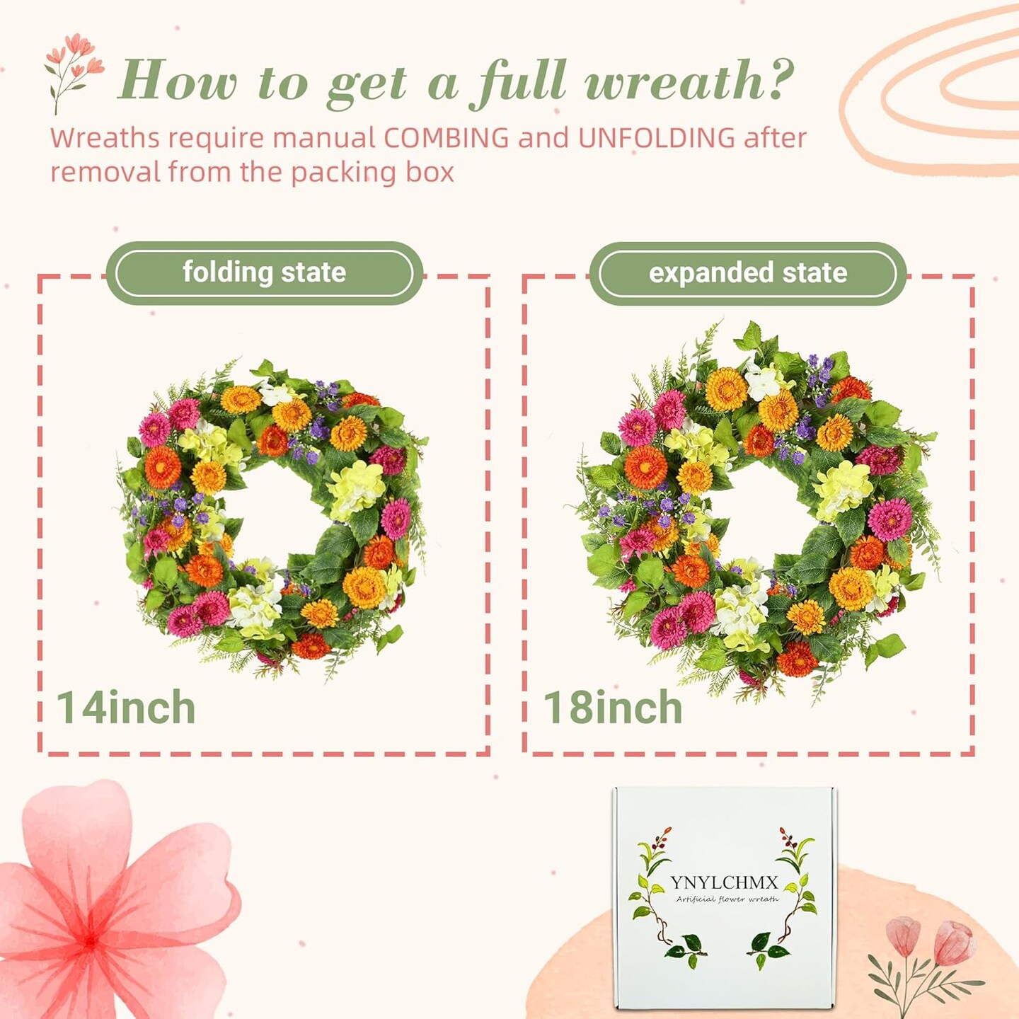 18" Summer Floral Wreaths for Front Door Summer Wreath with Daisy Flowers Green Tea Leaves, Artificial Floral Wreath Green Foliage Wreath for Wall Window Farmhouse Party Holiday Home Decor