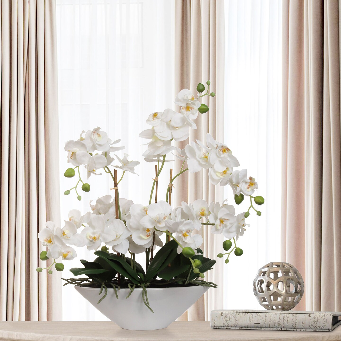 18" White Phalaenopsis Orchid Flowers in White Ceramic Vase, Floral Home by Artificial Flowers