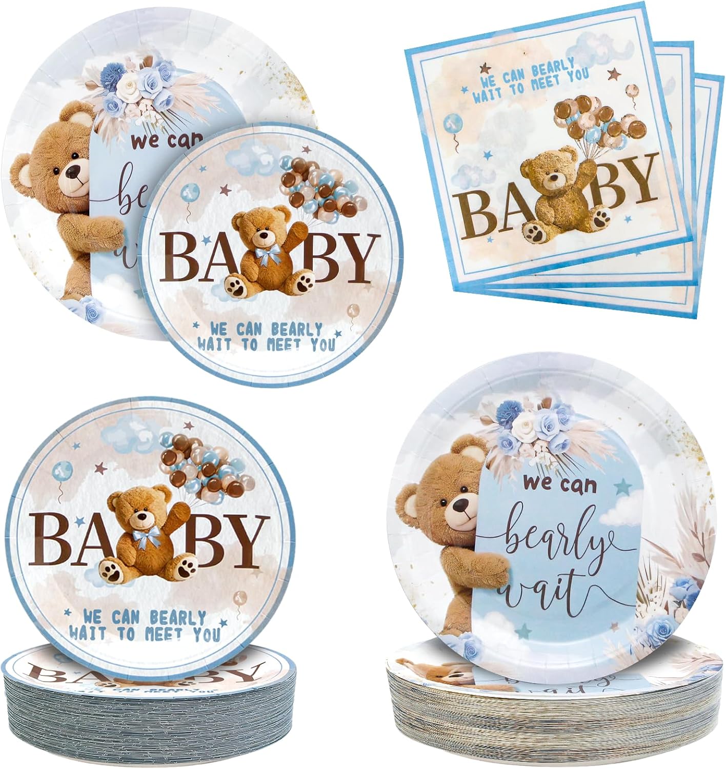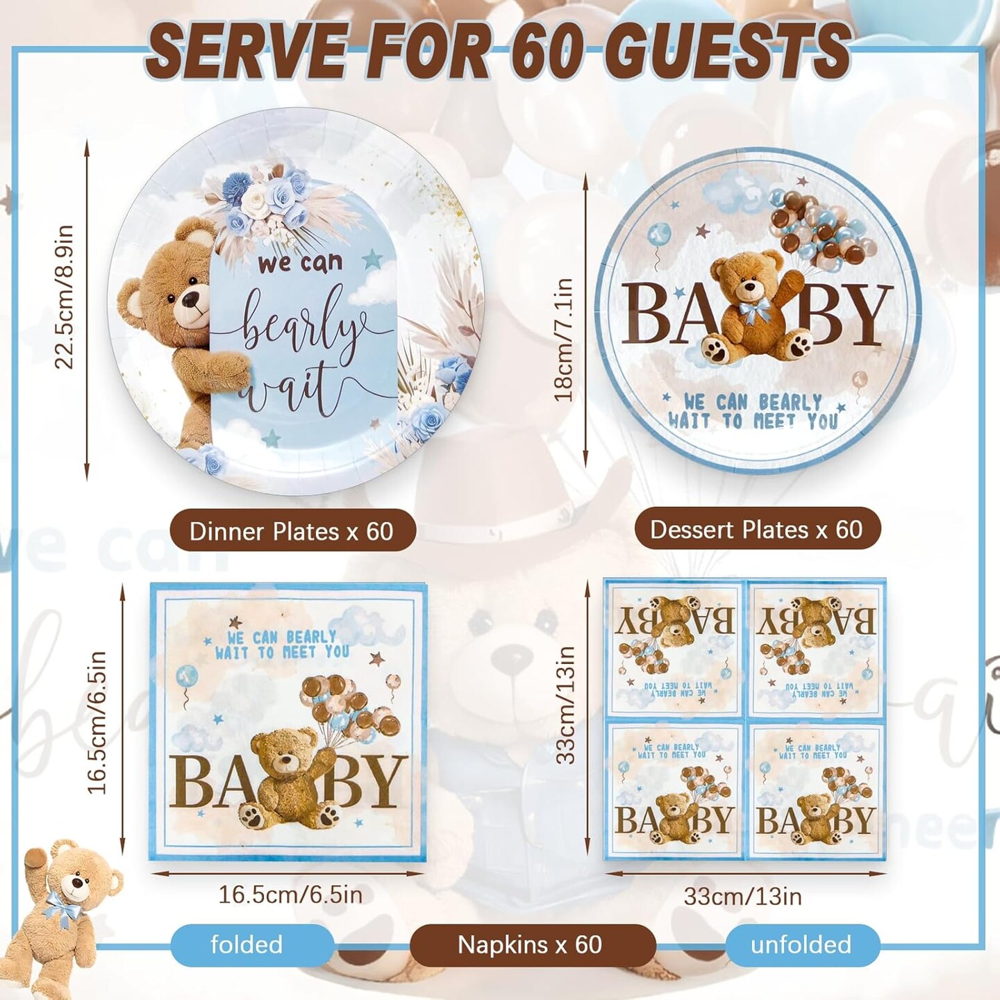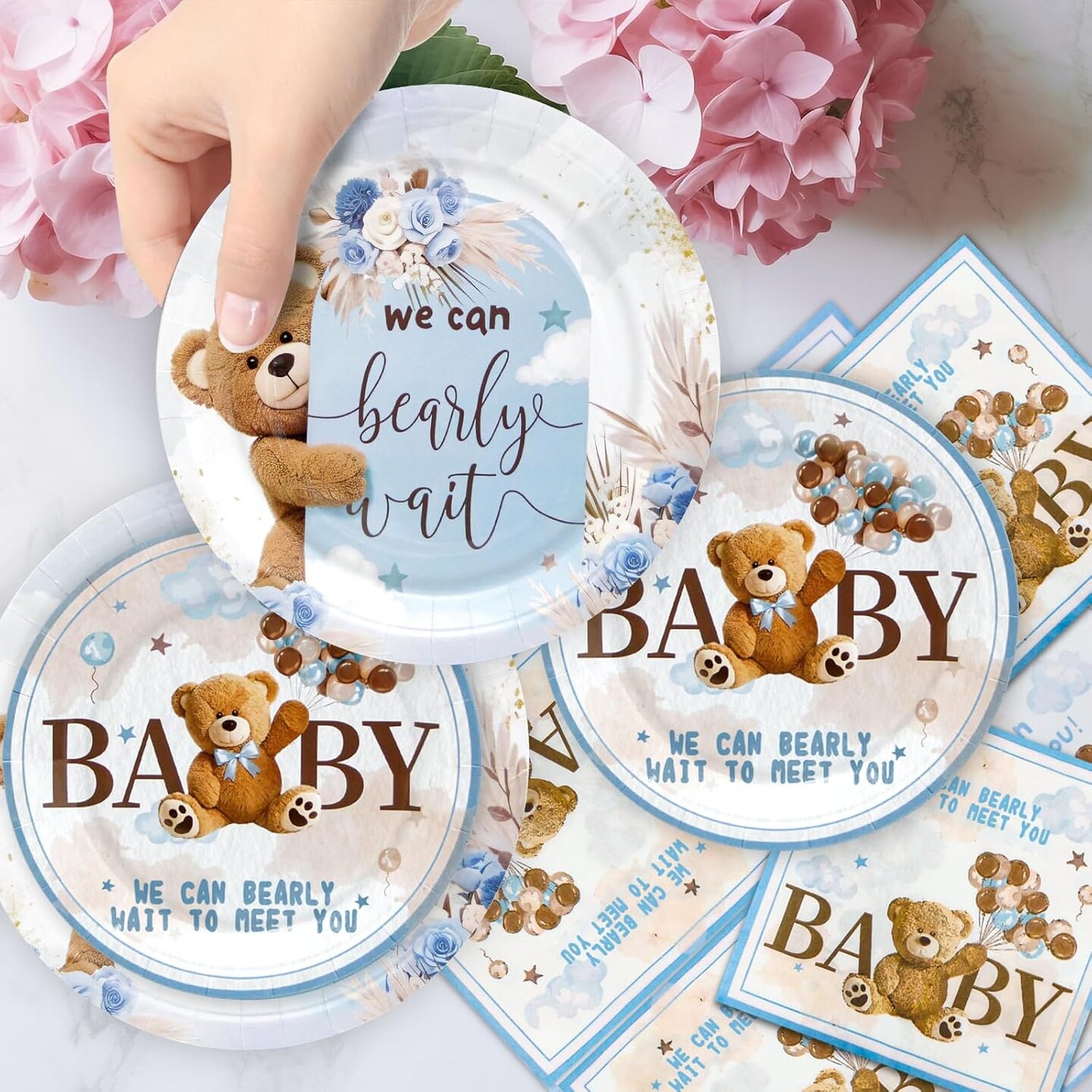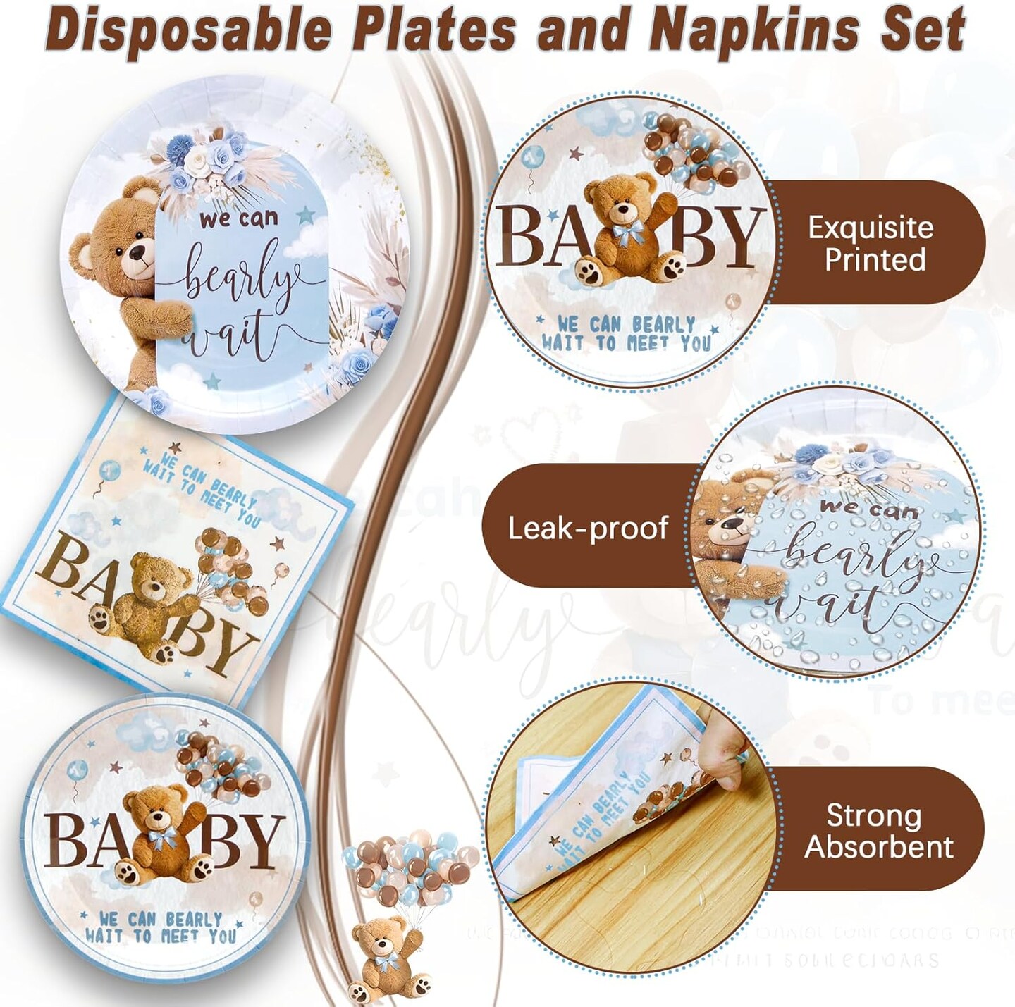 180PCS We Can Bearly Wait Baby Shower Decorations – Blue Bear Paper Plates and Napkins Set, Disposable Party Tableware Supplies(Blue)