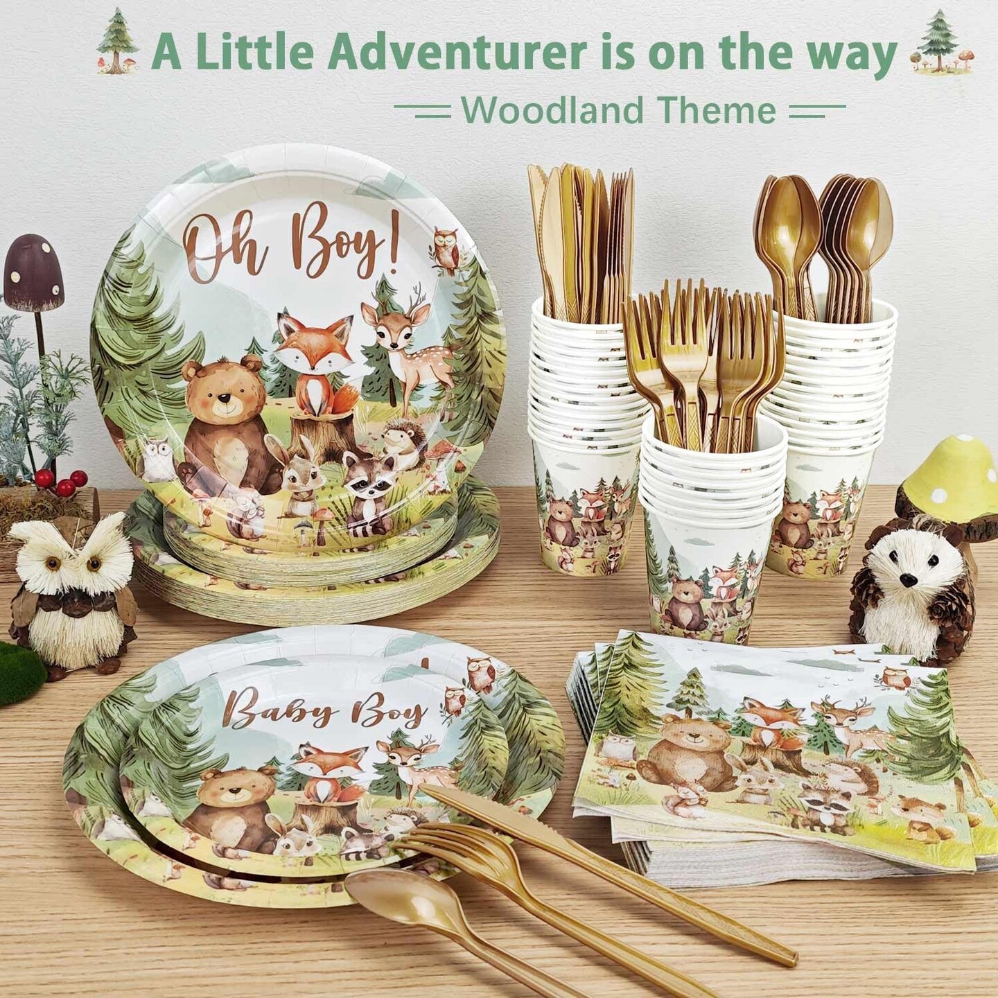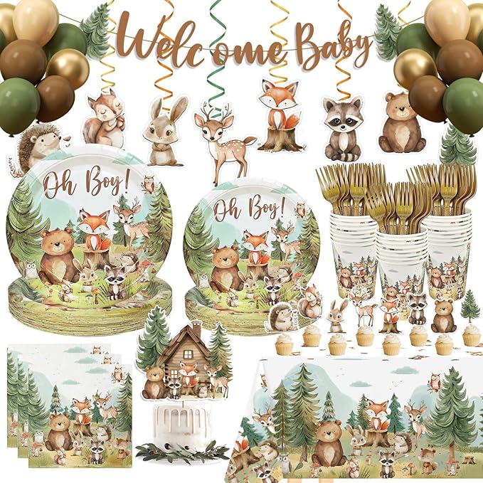 184pcs Woodland Animals Baby Shower Plates Set, Woodland Baby Shower Plates Napkins Cups Forks Tablecloth Banner Hanging Swirls Cupcake Toppers Balloons, 25 Guests