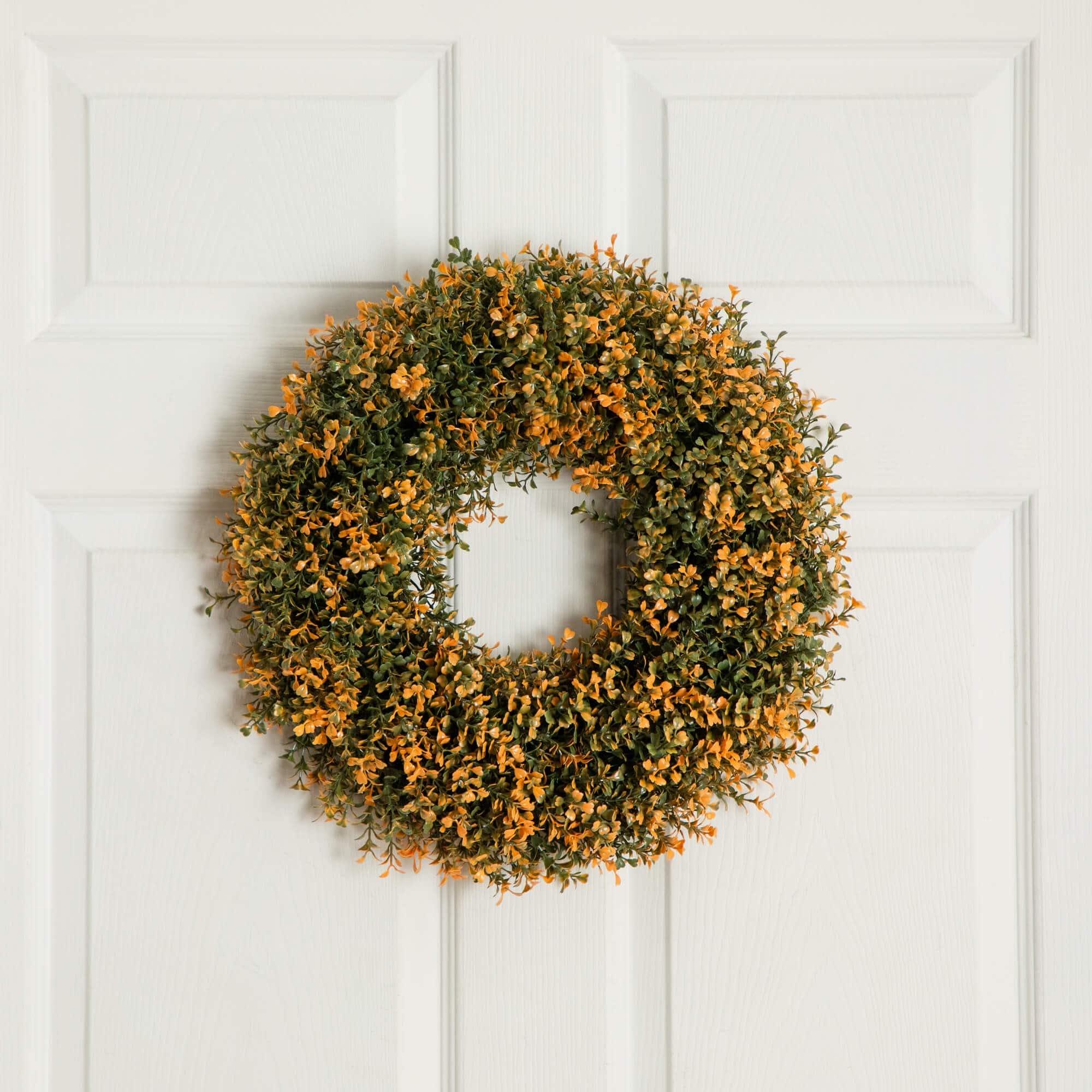 18in. Pre-Lit Autumn Boxwood Artificial Fall Wreath with 25 Warm White LED Lights