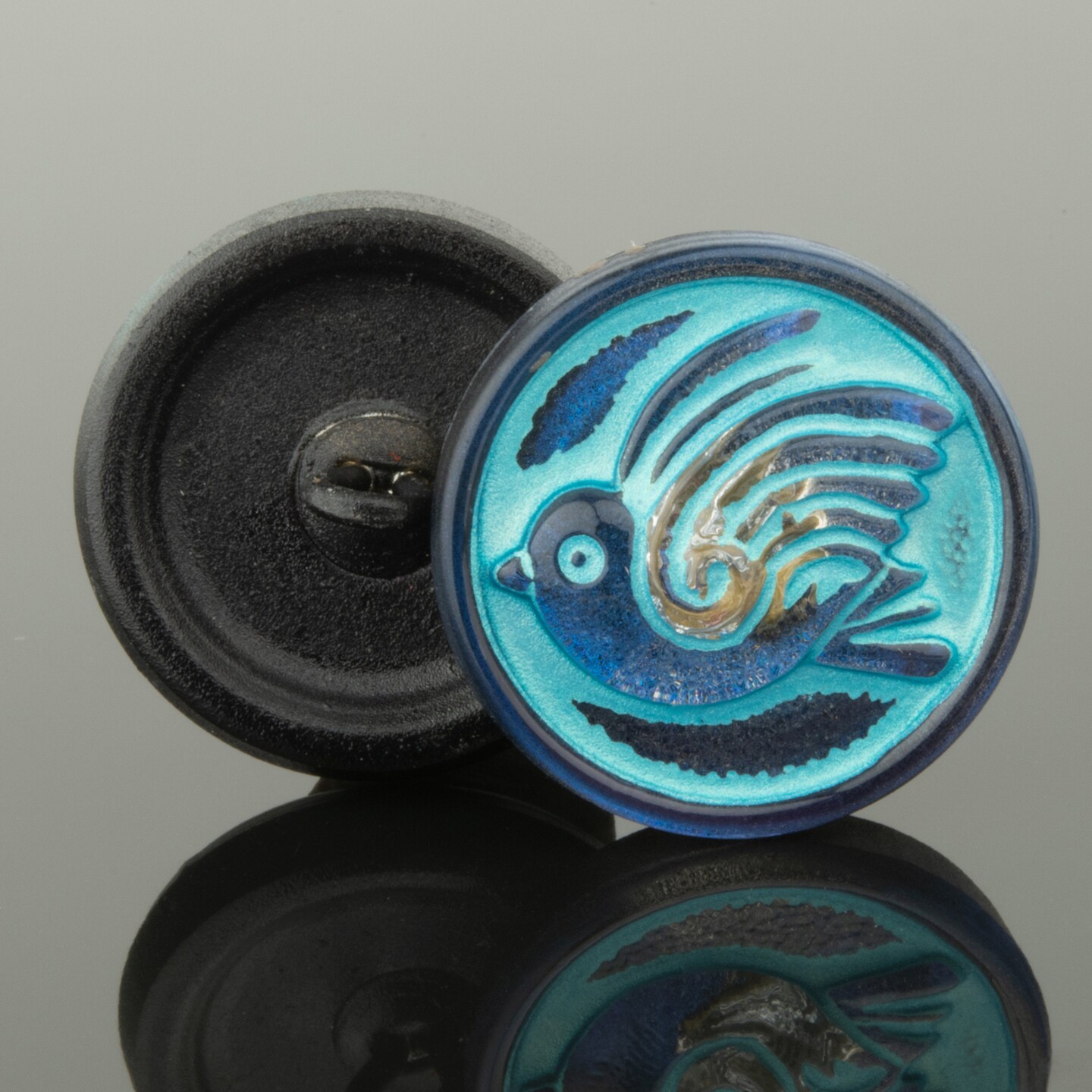 18mm Round Bird Design Button - Royal Blue with Aqua Wash -- Czech Glass Buttons