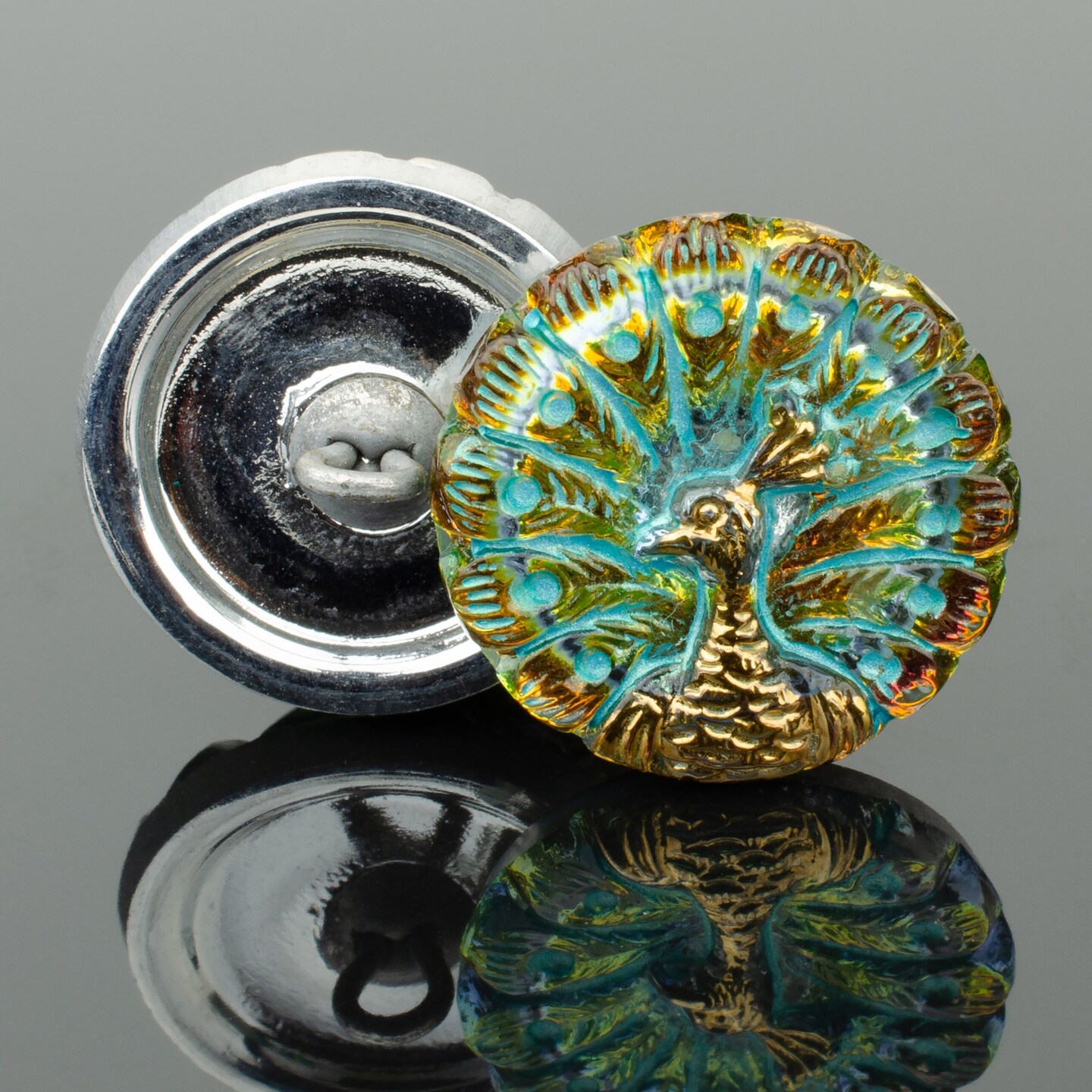 18mm Round Peacock Button Golden Orange Iridescent with Turquoise Wash and Gold Paint -- Czech Glass Buttons