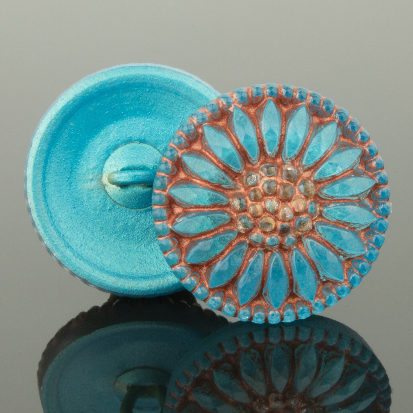 18mm Round Sunflower Button - Aqua Blue with Copper Wash -- Czech Glass Buttons