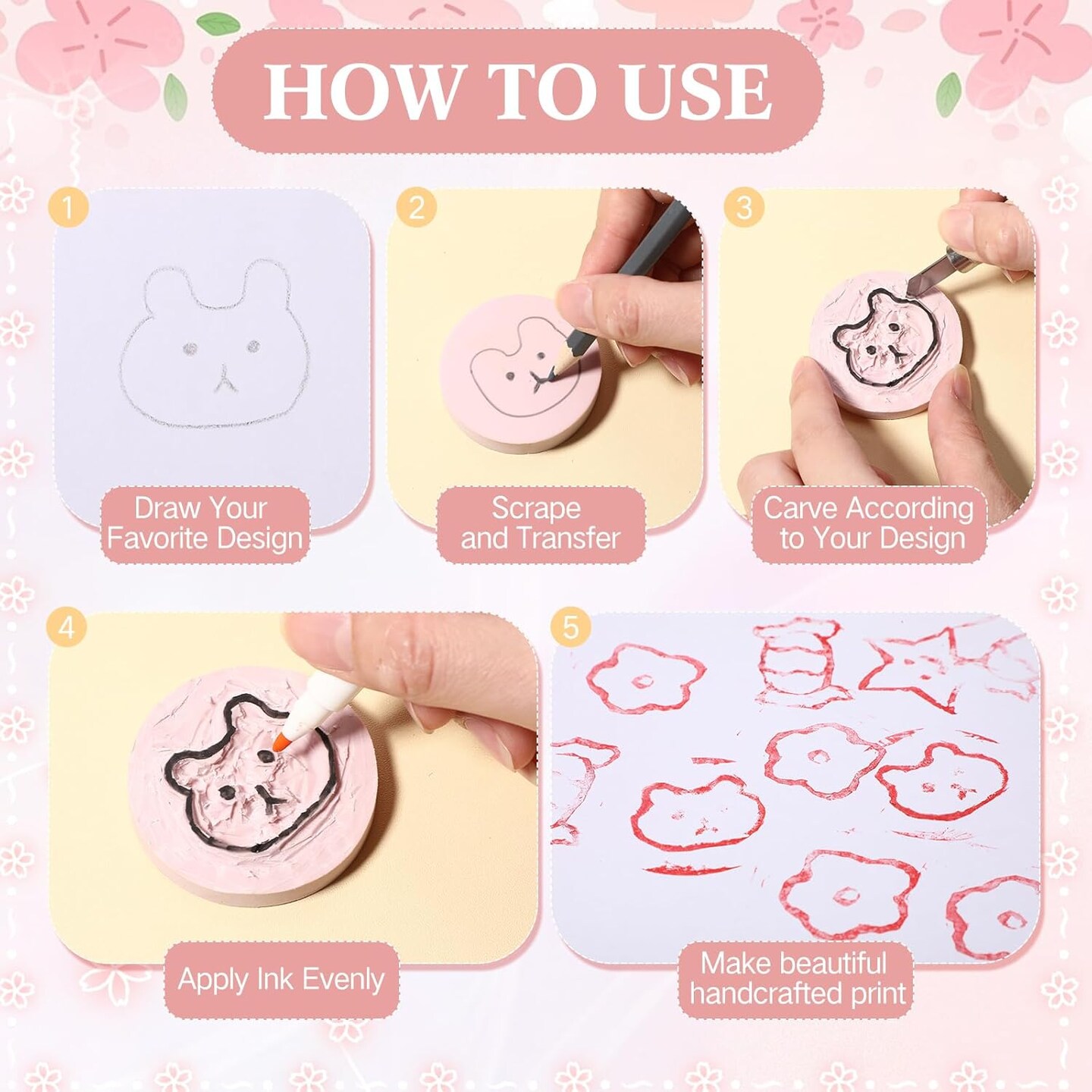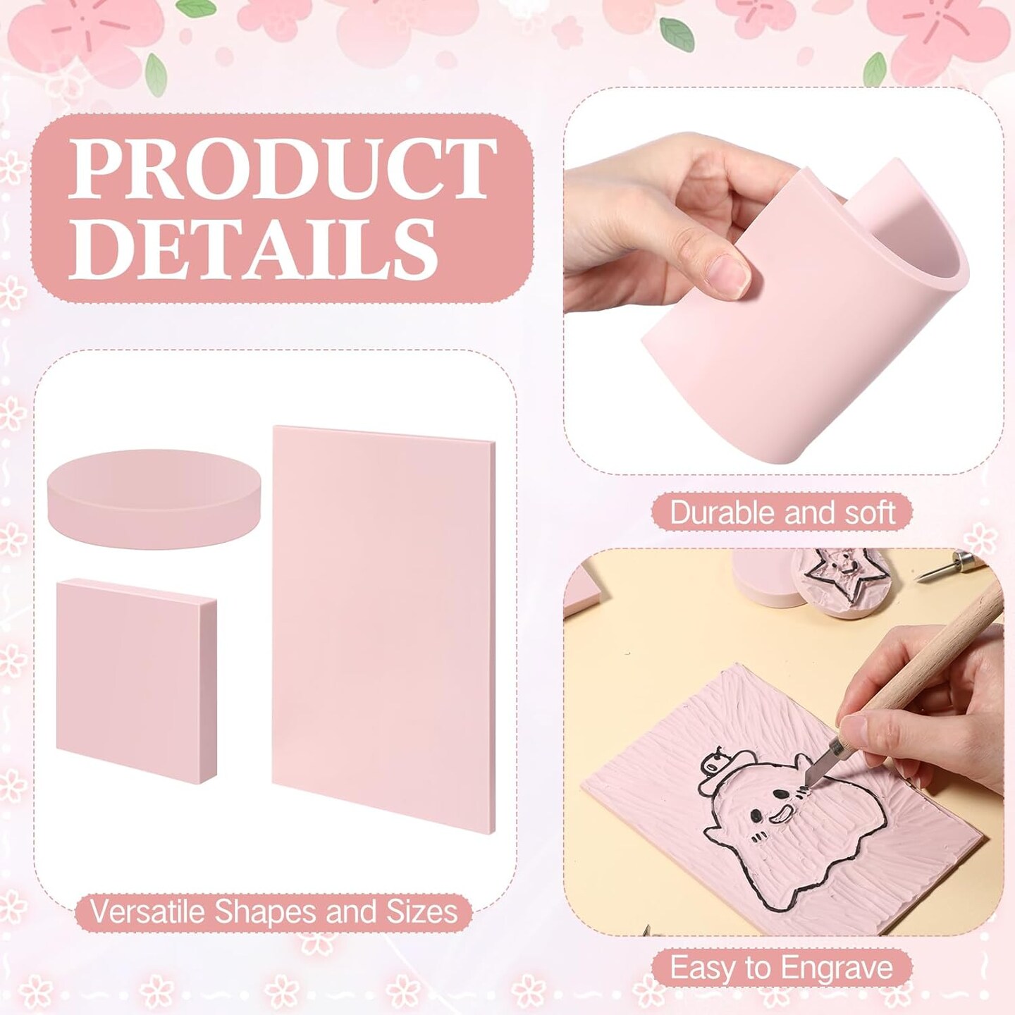 18-Pack Pink Rubber Carving Blocks, Round & Square for Stamps & DIY Crafts