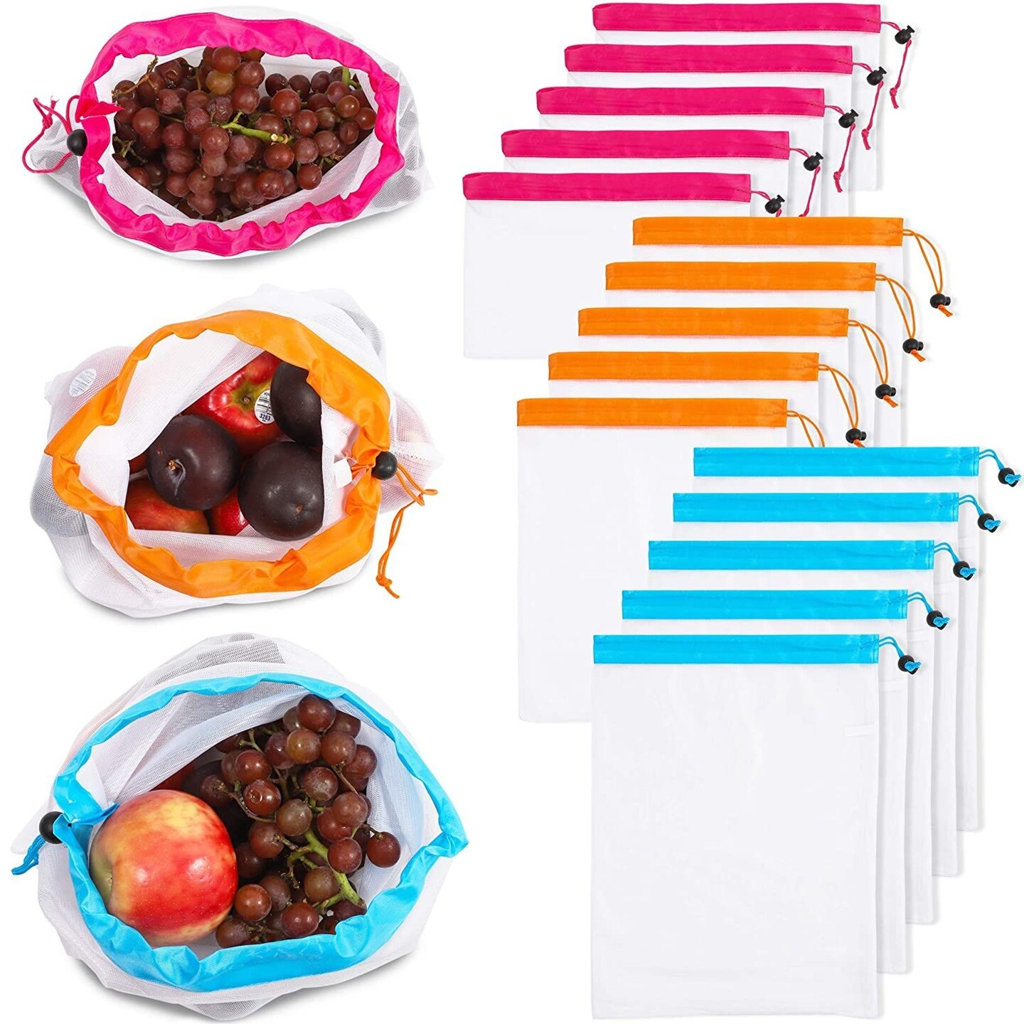 18-Pack Reusable Mesh Produce Bags, Washable Food Fruit Vegetable Storage Bags Eco Friendly, 3 Colors, 3 Sizes
