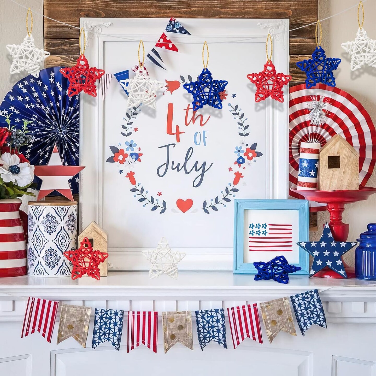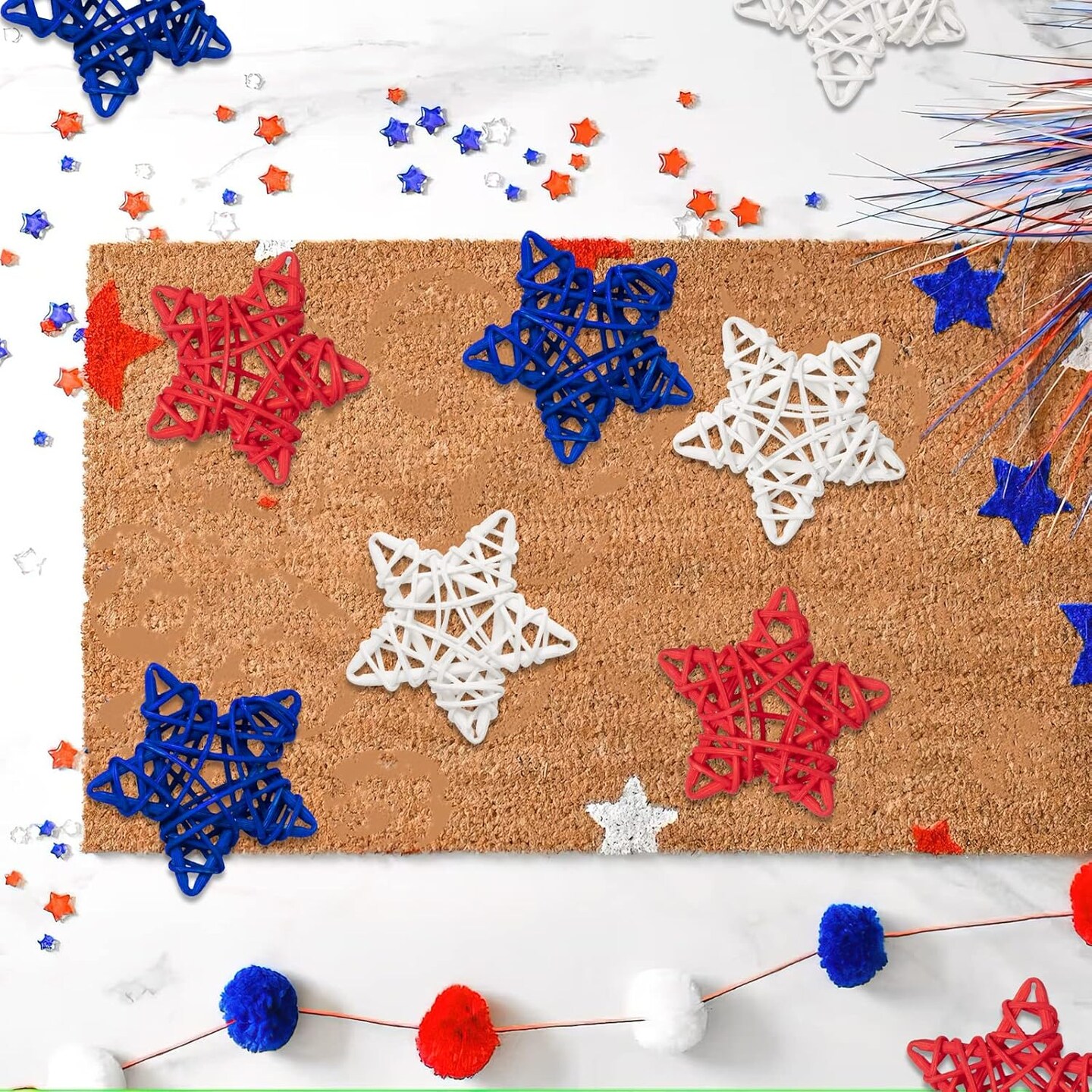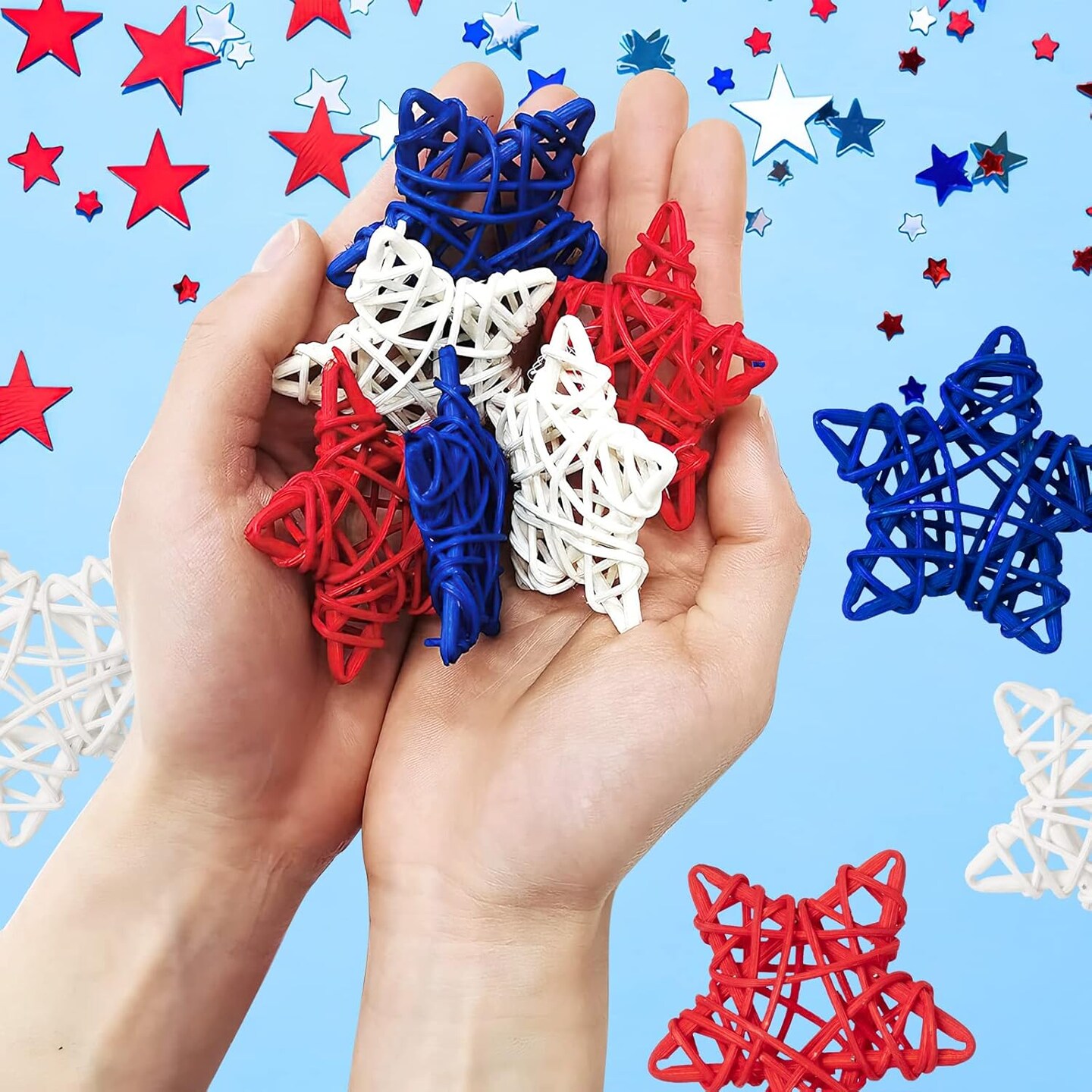18pcs 4th of July Star Rattan Decoration, Red Blue White Stars for 4th of July Independence Day Home Decor DIY Craft Vase Bowl Filler Table Decoration