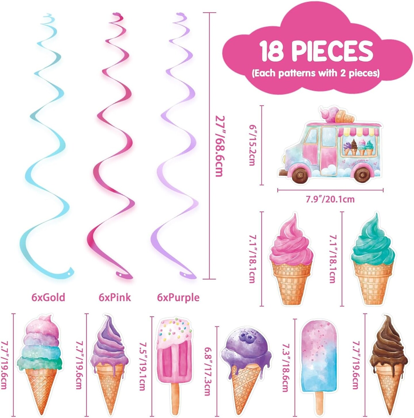 18PCS Ice Cream Hanging Swirl Decorations – Sweet Summer Ceiling Streamers for Girls Birthday, Baby Shower, Ice Cream Party Supplies & Candy Theme Decor