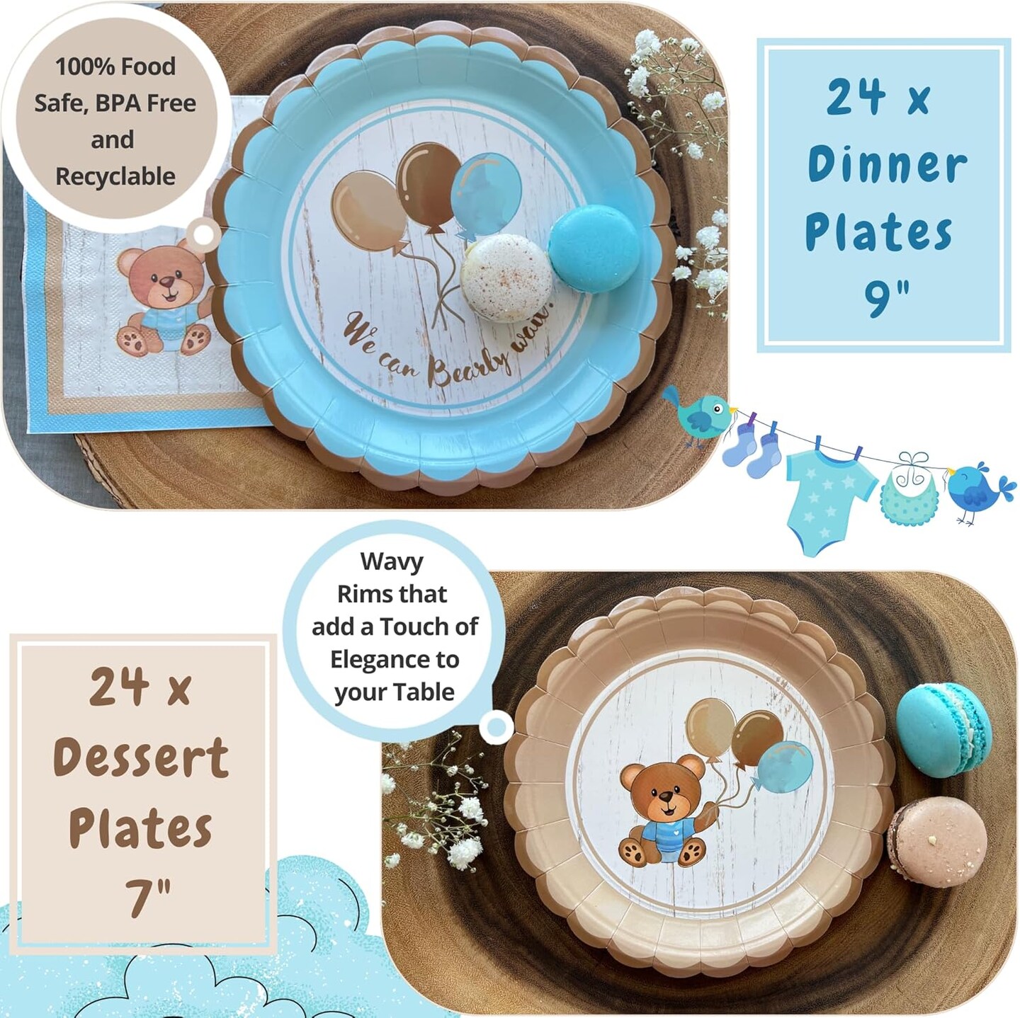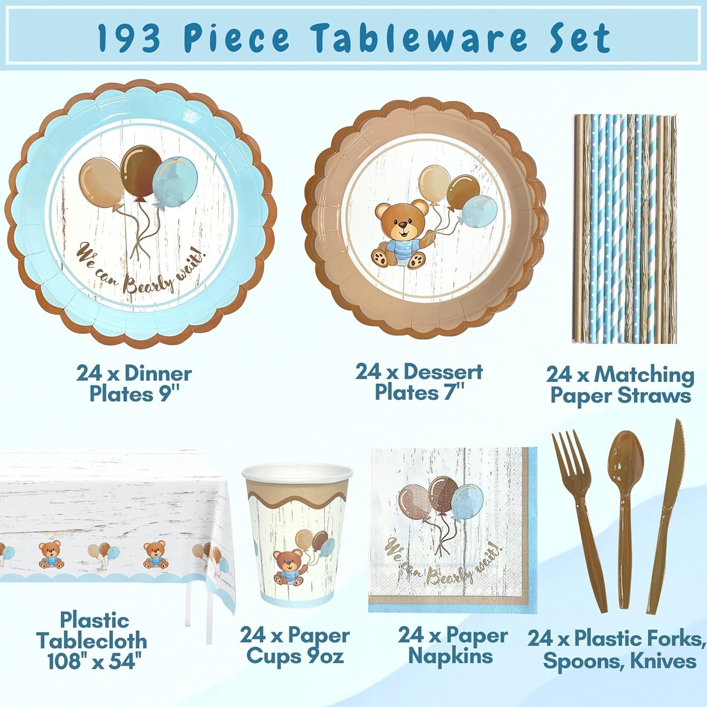 193 Pc Teddy Bear Baby Shower Decorations Tableware, Serves 24 (Blue and Brown)
