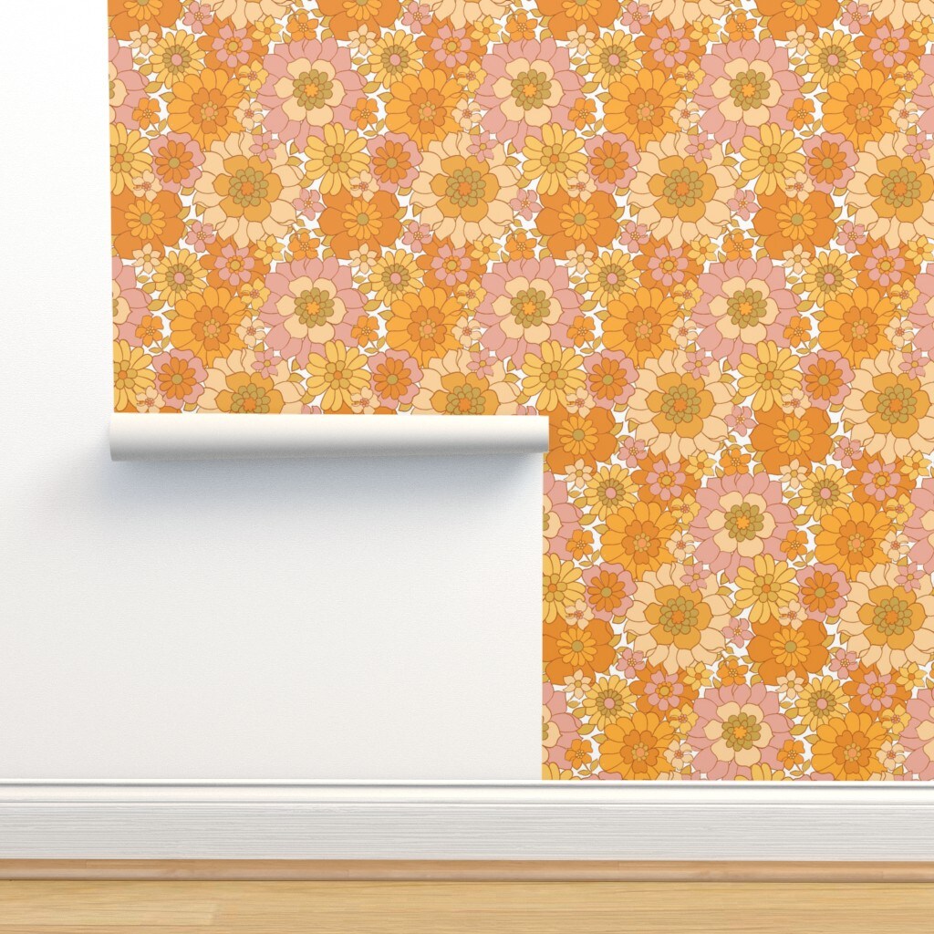 1970S Floral Orange Retro Flowers Vintage Boho 1960S Flower Power Bright Sunny Groovy Custom Pre-pasted Wallpaper by Spoonflower Pre-Pasted Wallpaper 2FT Wide