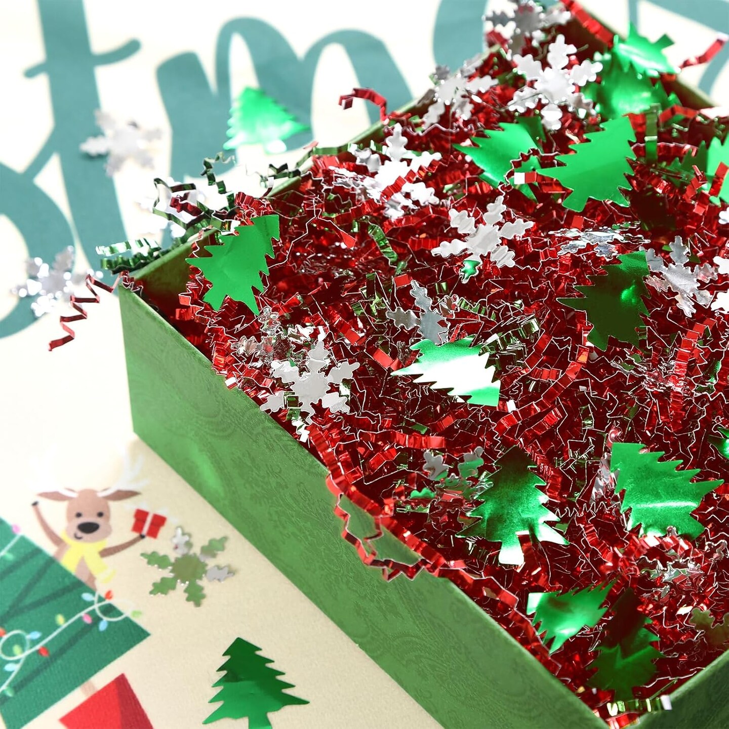 1LB Metallic Red Green Crinkle Cut Paper Shred Filler w/Tree & Snowflake Confetti, Christmas Gift Wrap Packaging Raffia Tissue Strand, Craft Bedding Cushion, Winter Birthday Box Basket