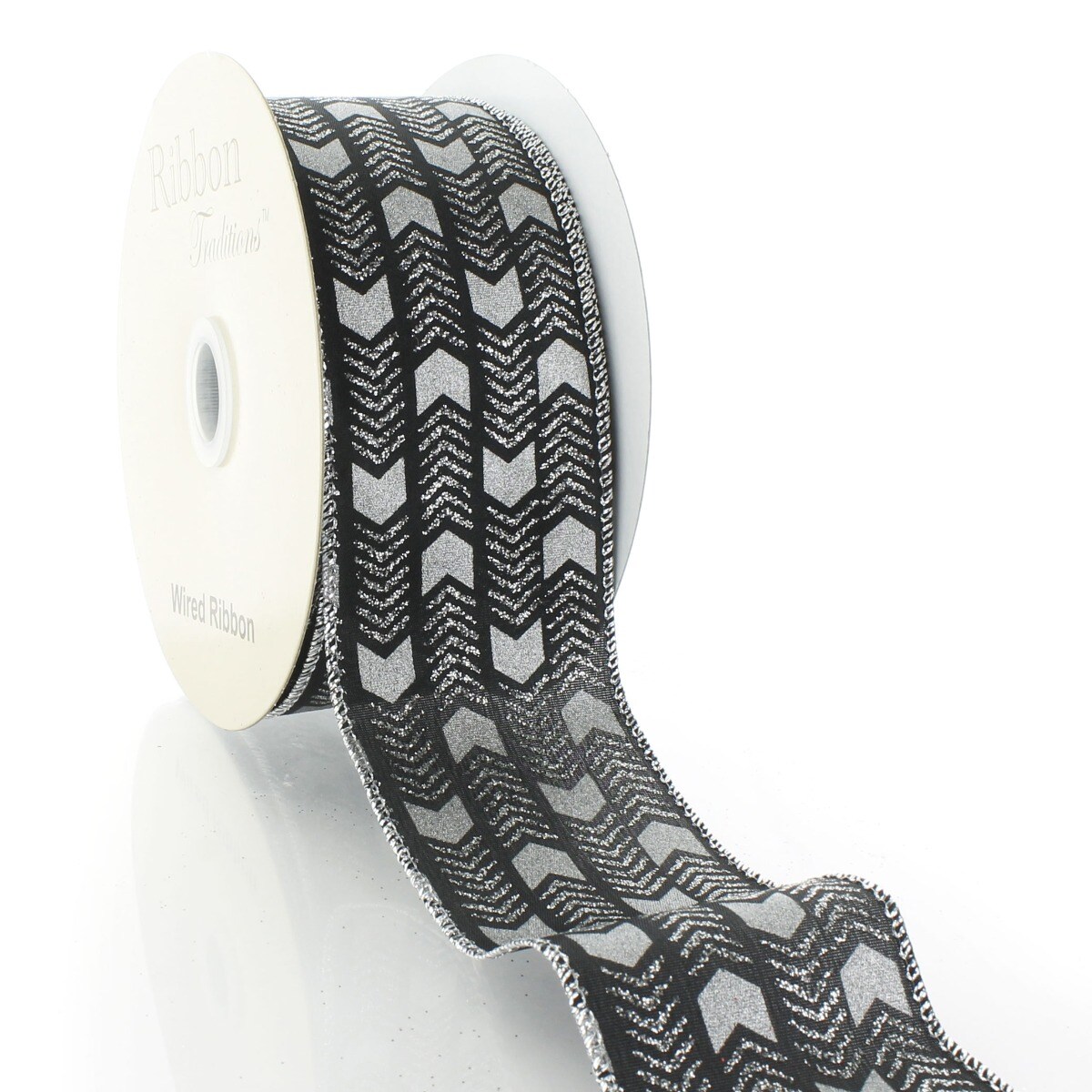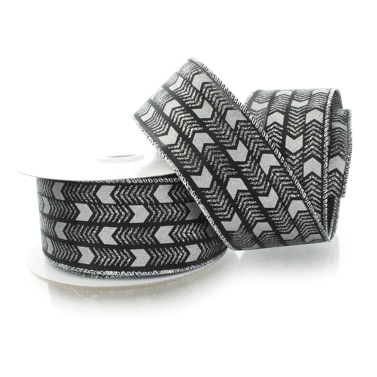 2 1/2" Wired Ribbon Black w/ Silver Glitter Arrows 10 Yards