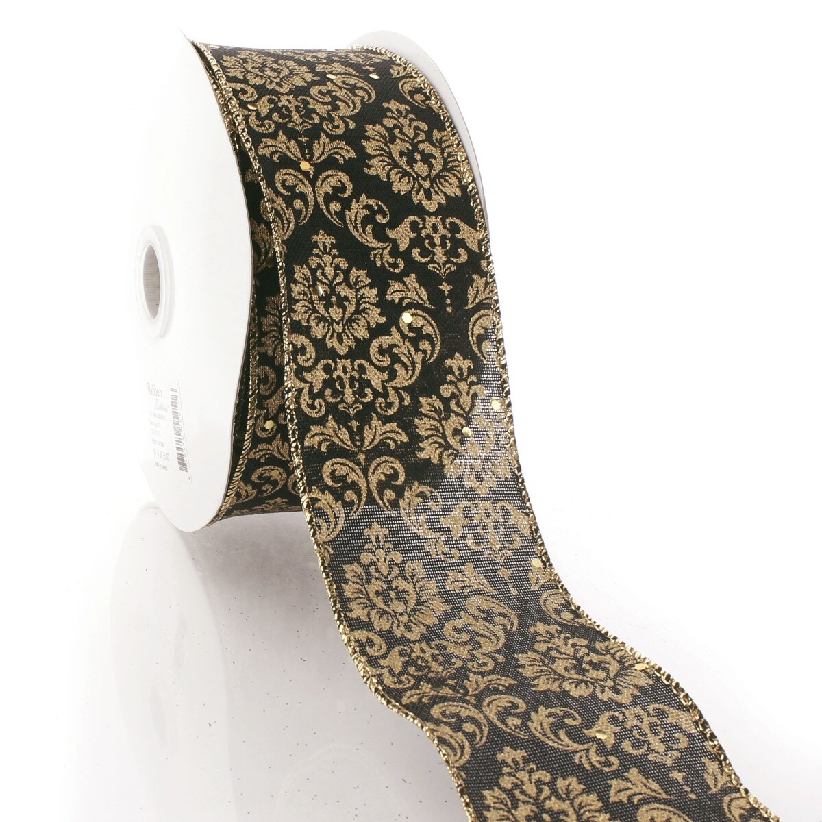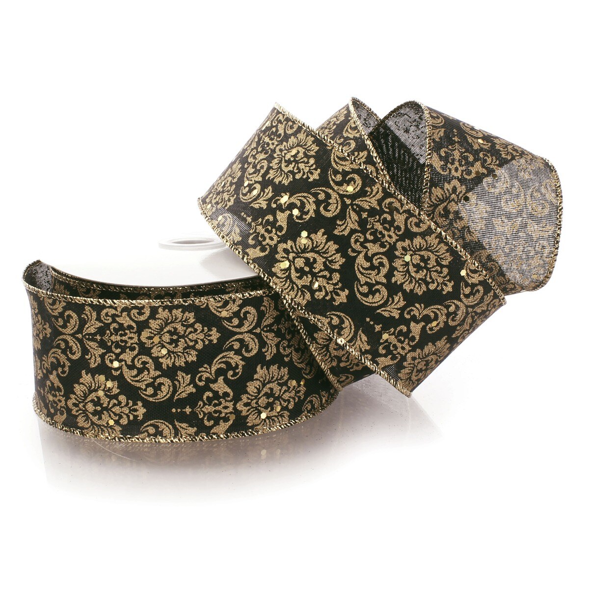 2 1/2" Wired Ribbon Black/Gold Damask - 25 Yards