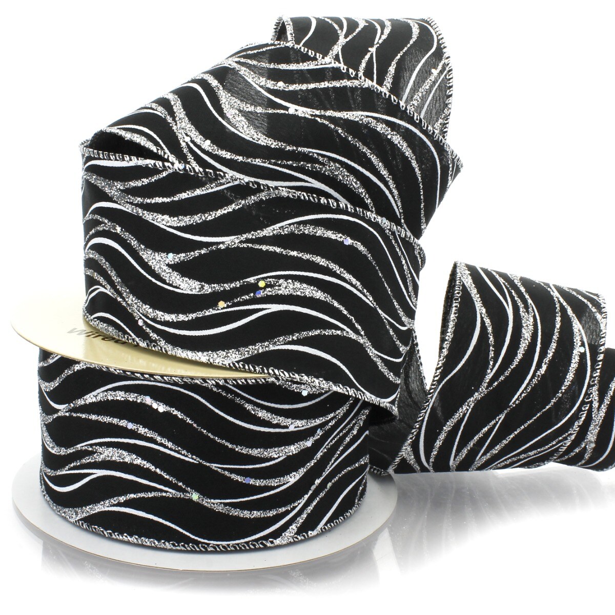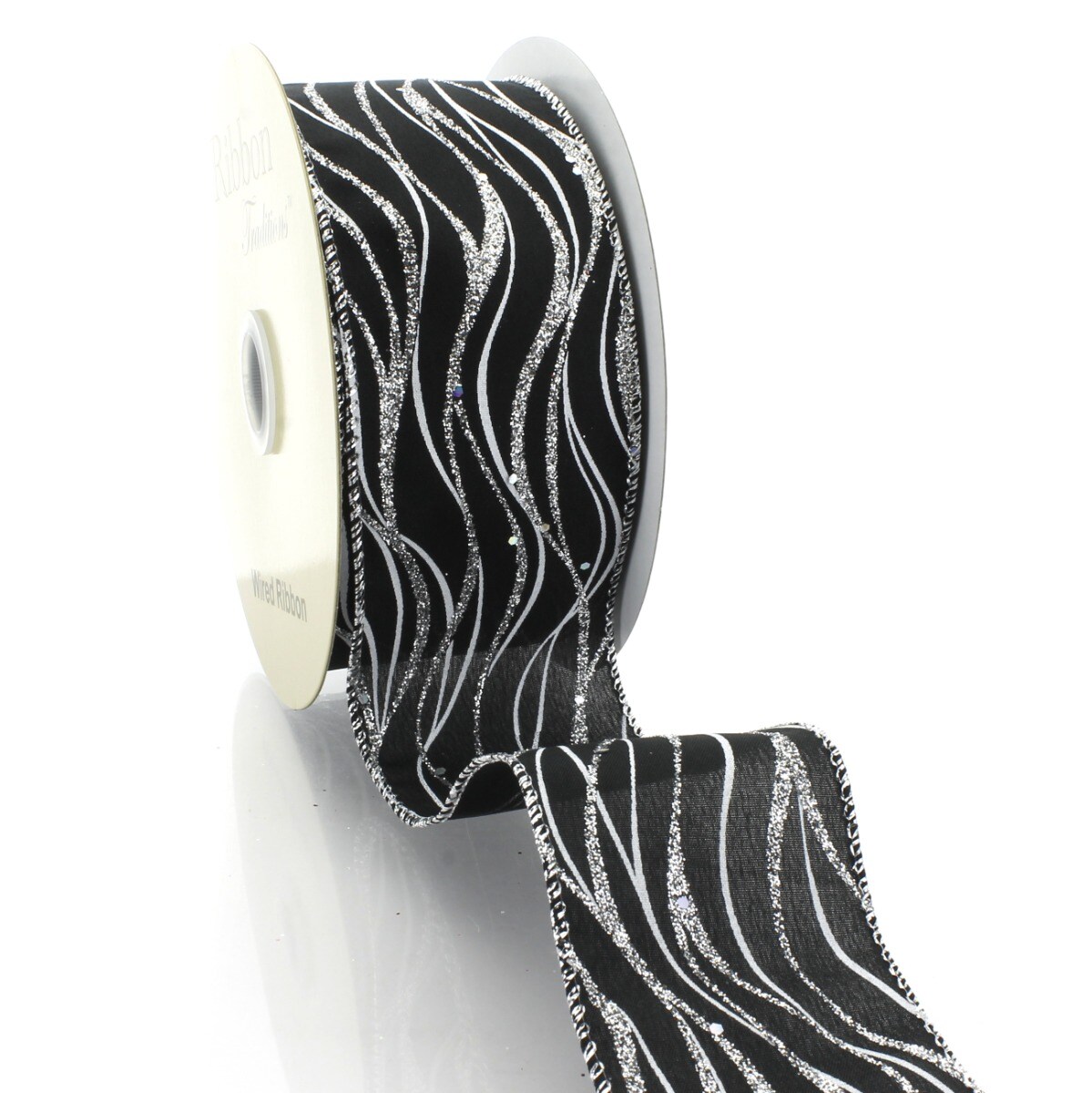 2 1/2" Wired Ribbon Black-Silver Glitter Wave 10 Yards