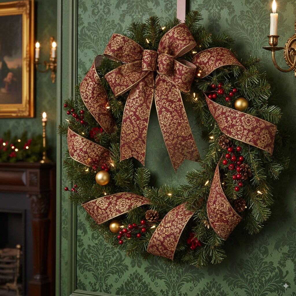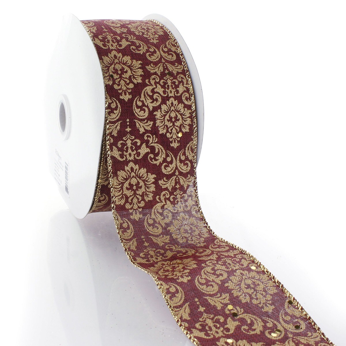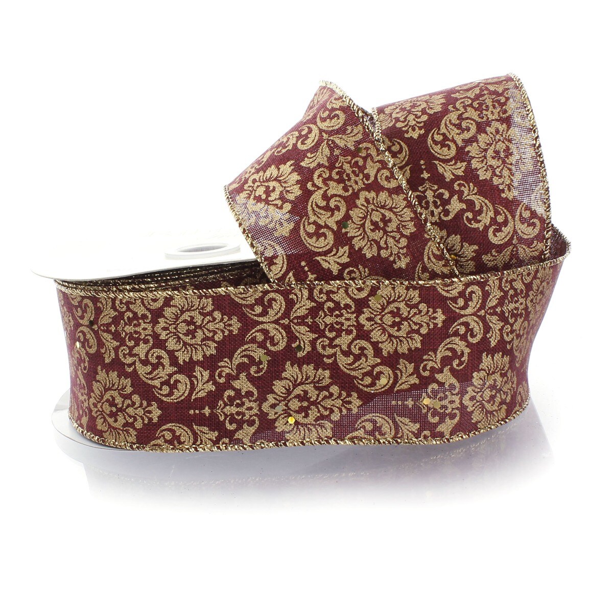 2 1/2" Wired Ribbon Burgundy/Gold Damask - 10 Yards