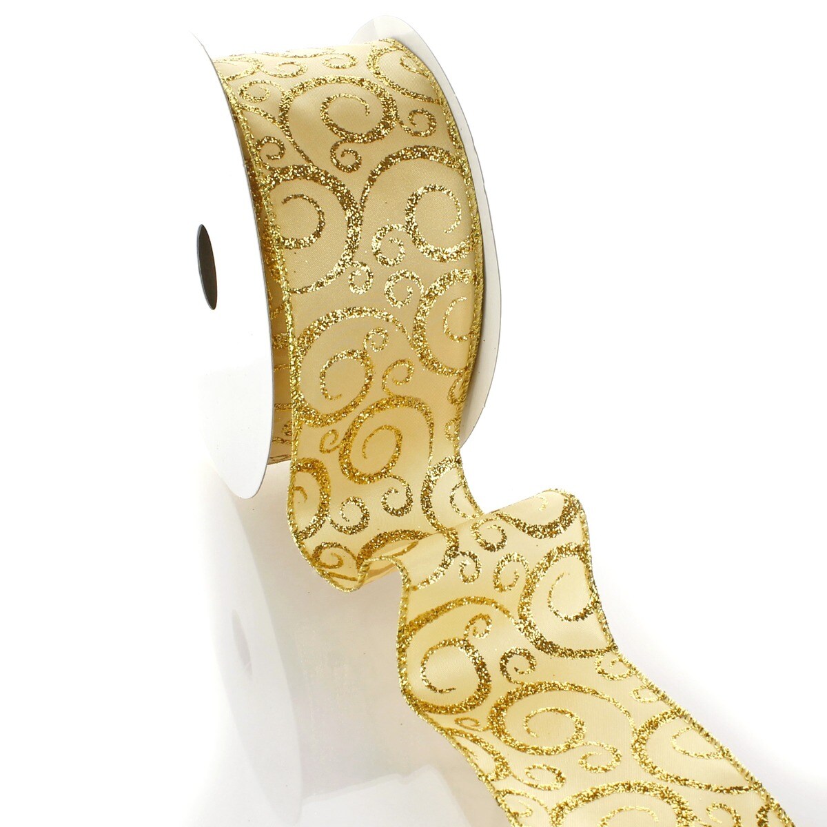 2 1/2" Wired Ribbon Glitter Swirl Scrolls Gold - 10 Yards