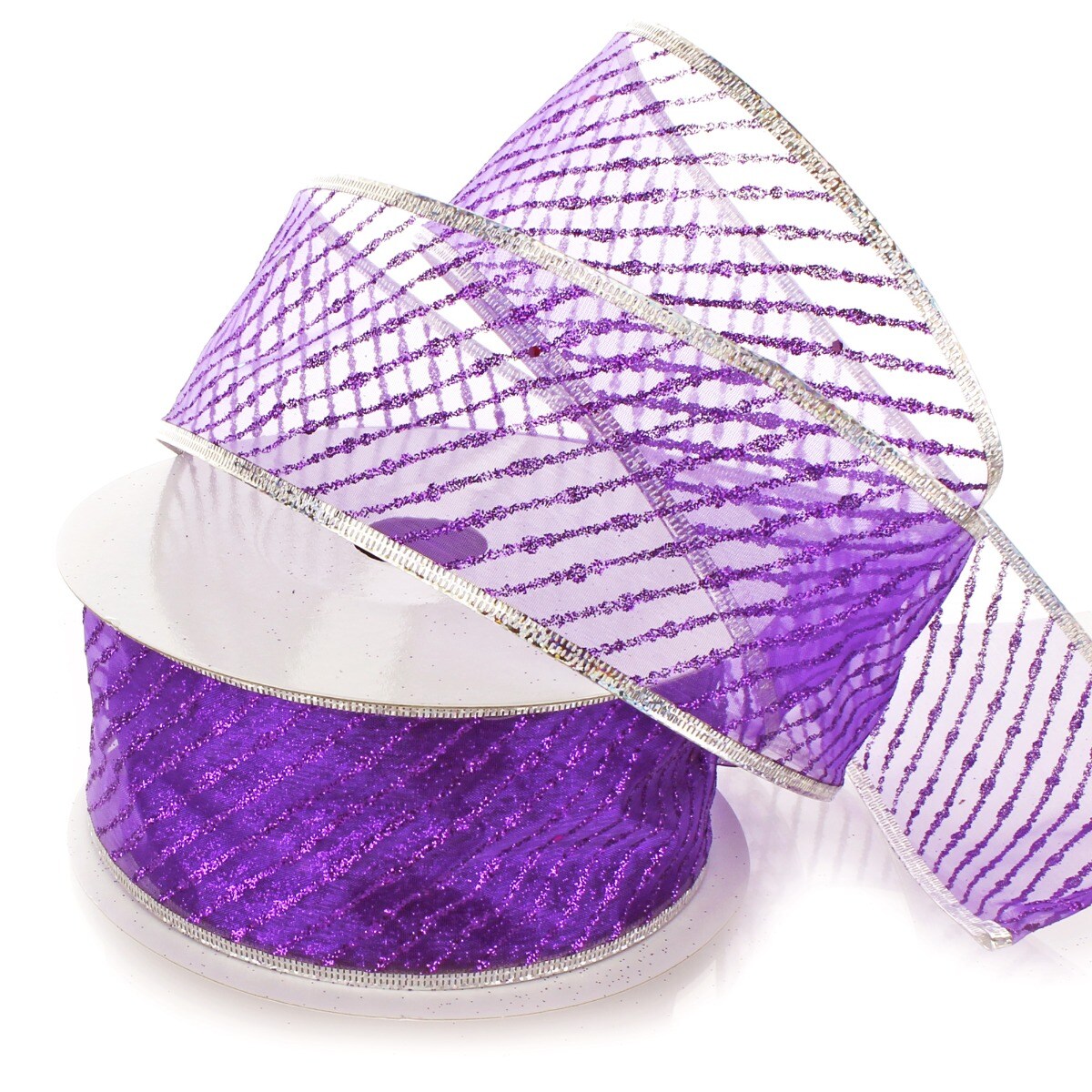 2 1/2" Wired Ribbon Metallic Banded Edge Sheer Diagonal Stripes Purple/Silver - 10 Yards