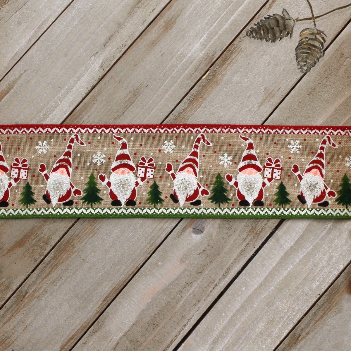 2 1/2" Wired Ribbon Nordic Christmas Gnomes on Burlap - 25 Yards