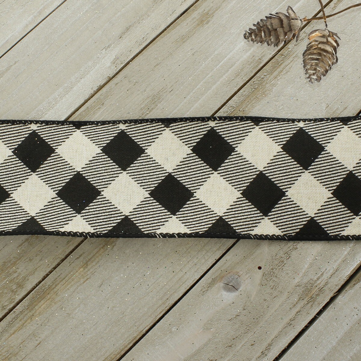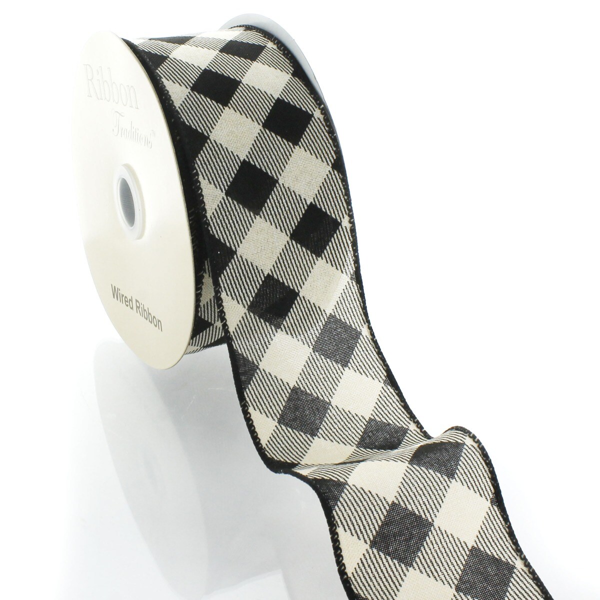 2 1/2" Wired Ribbon Off-White/Black Diagonal Buffalo Plaid 10 Yards