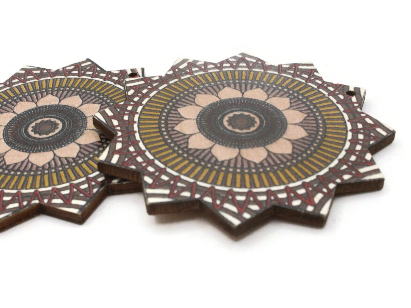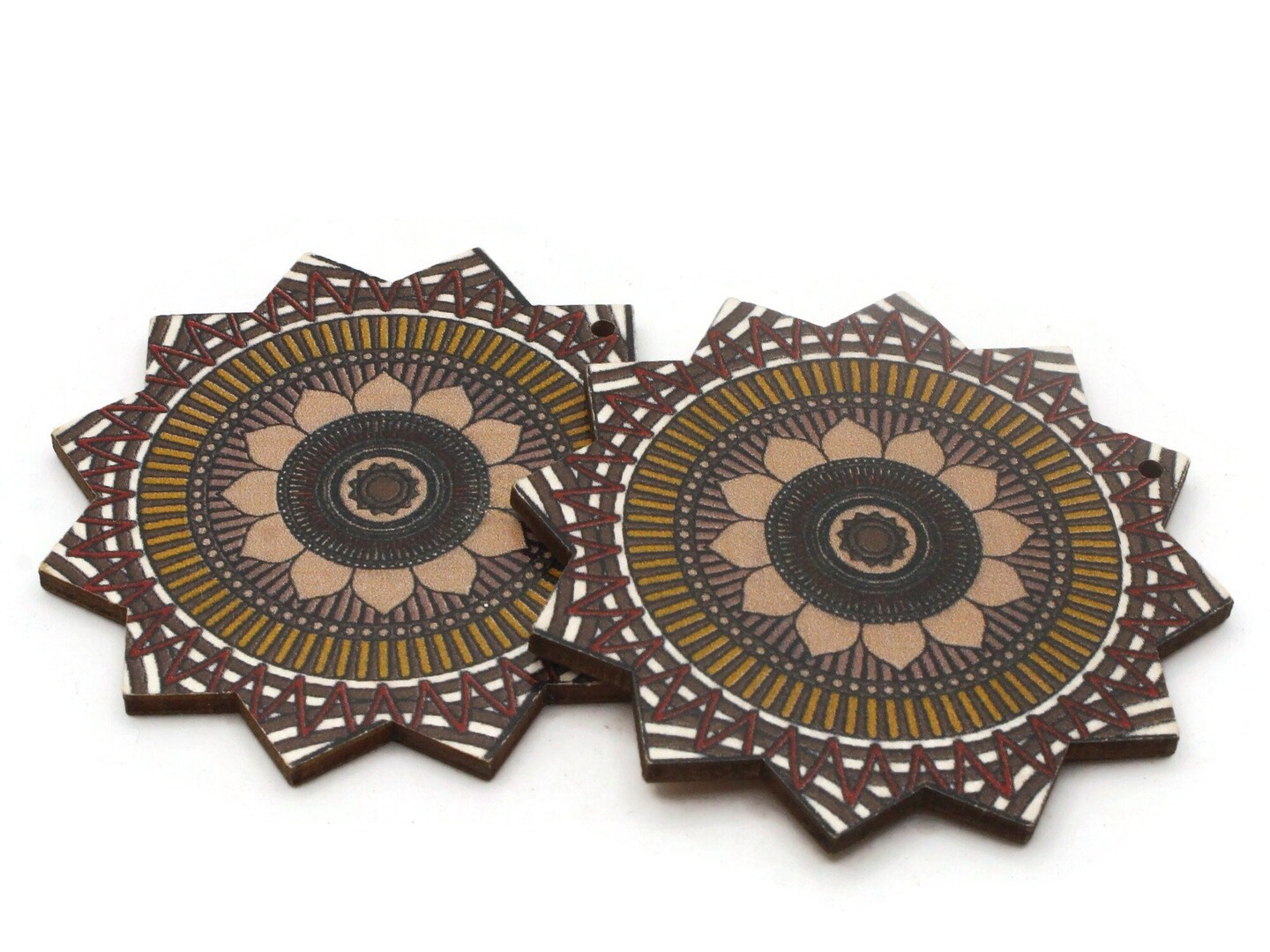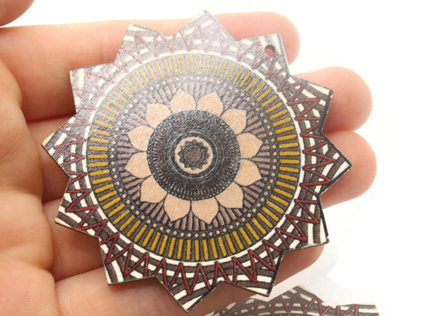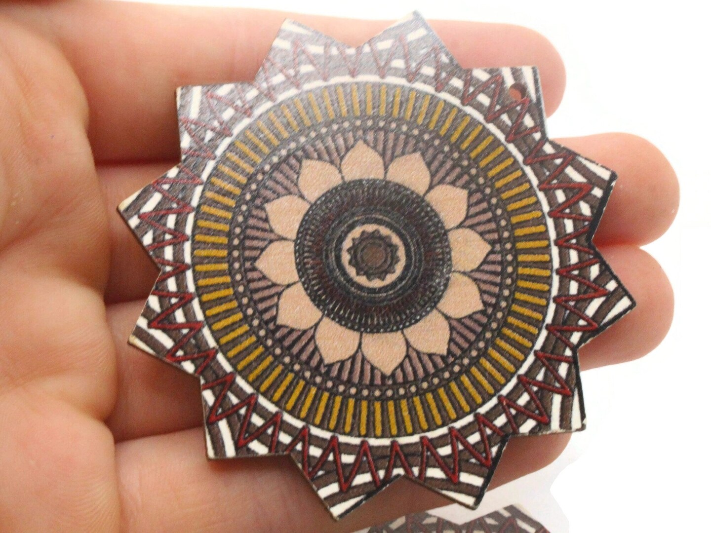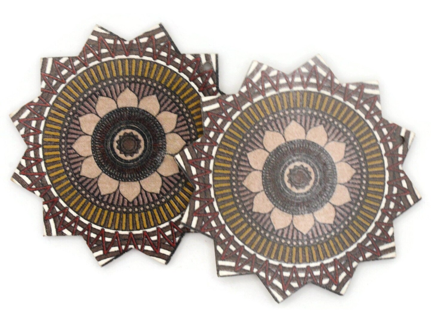 2 61mm Brown and Cream Printed Flat Wood Flower Pendants