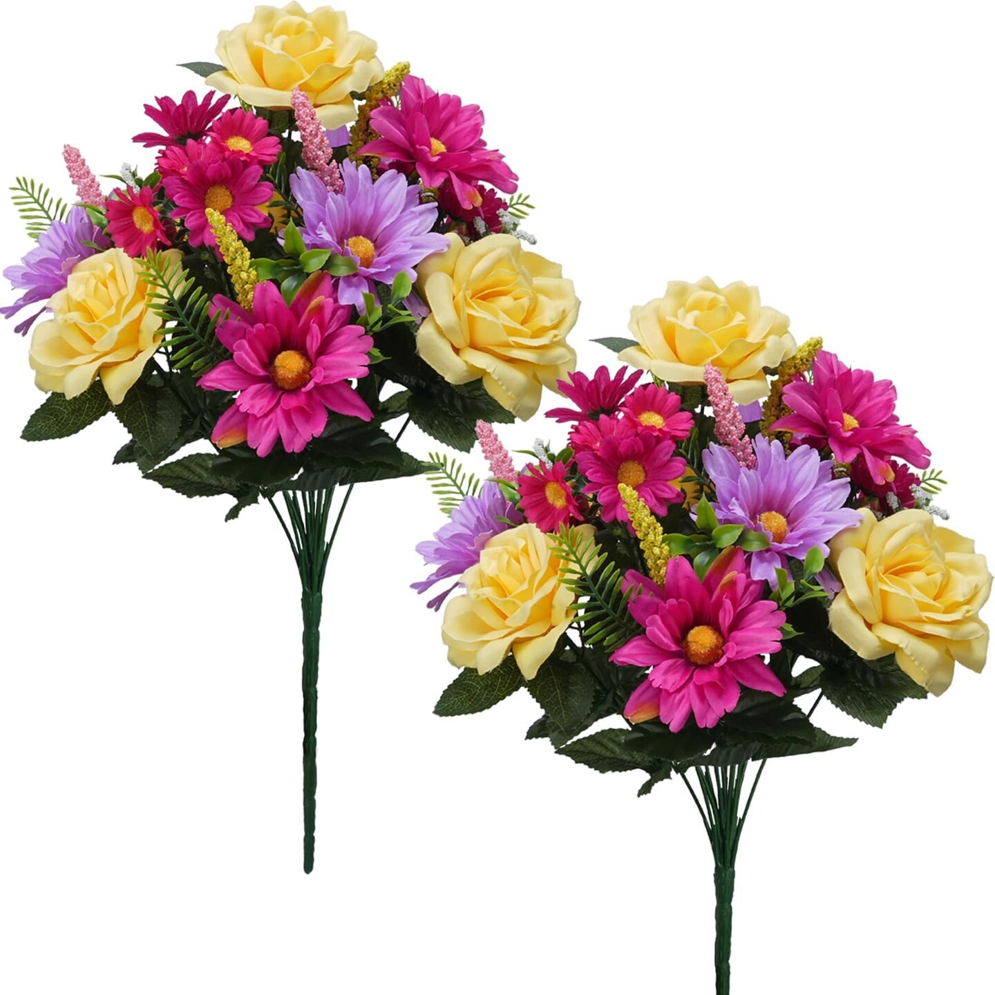 2 Bunches Cemetery Flowers for Grave Vase – 15” Artificial Rose & Daisy Silk Bouquet for Memorial, Summer Decoration, and Table Centerpiece