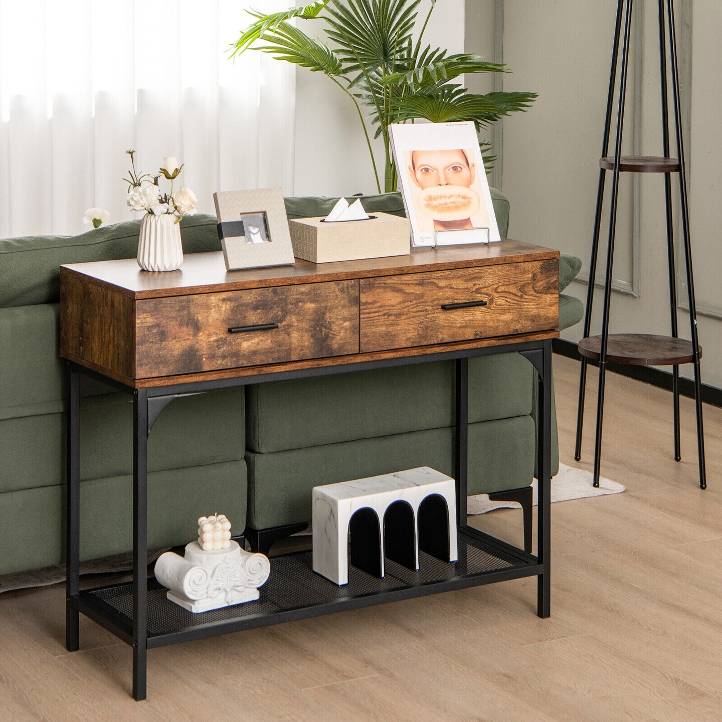 2 Drawers Console Table with Metal Frame for Living Room-Rustic Brown