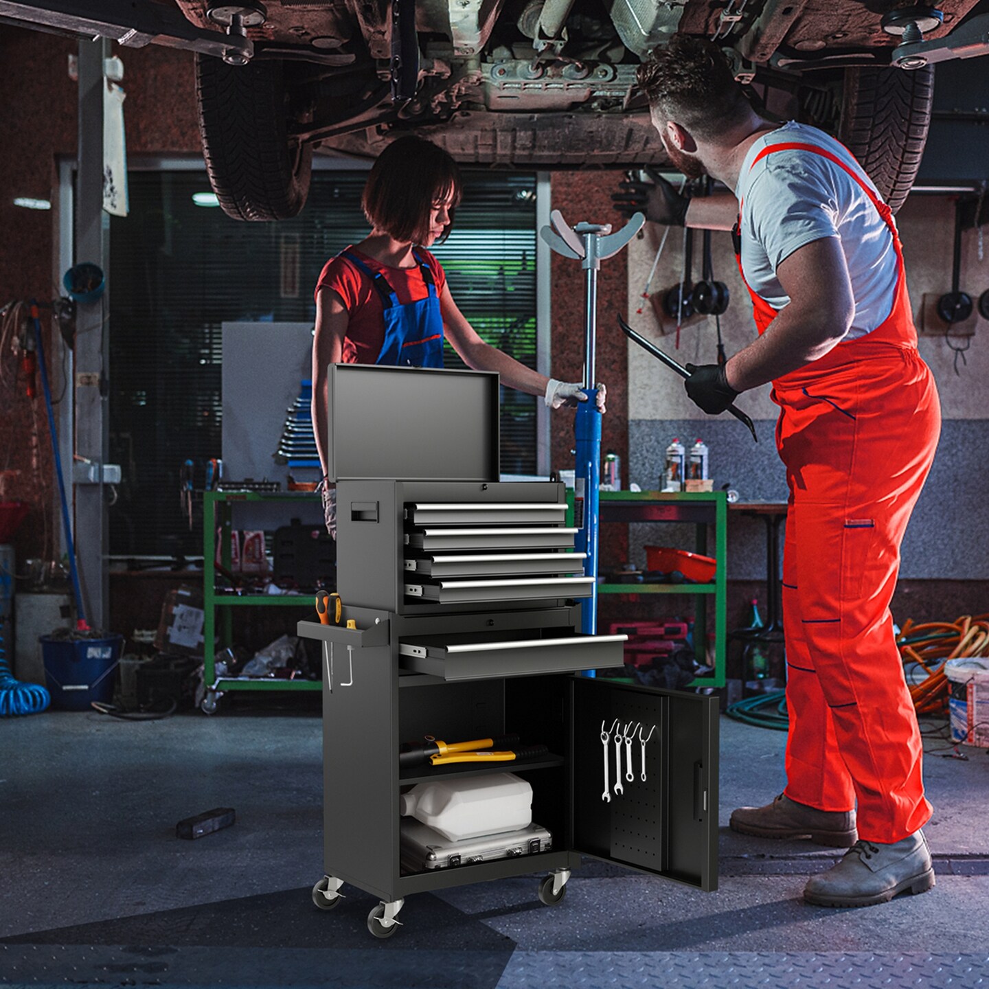 2 in 1 Tool Chest & Cabinet with 5 Sliding Drawers Rolling Garage Organizer