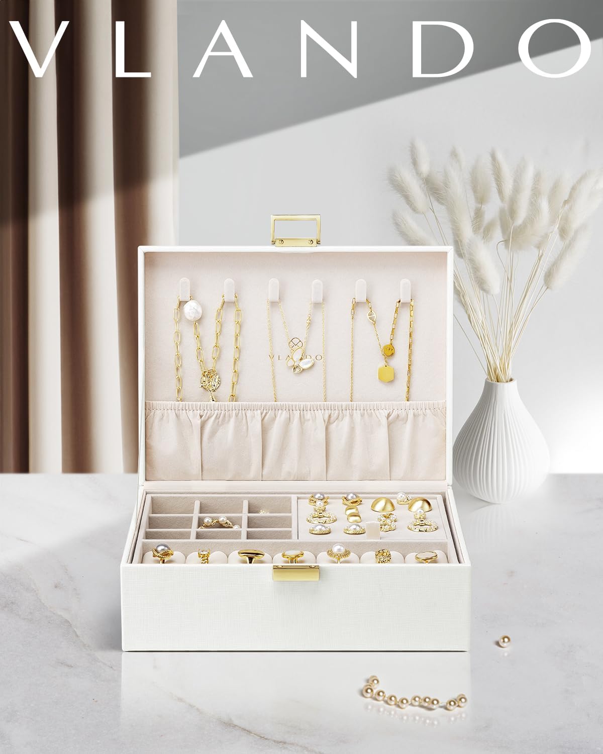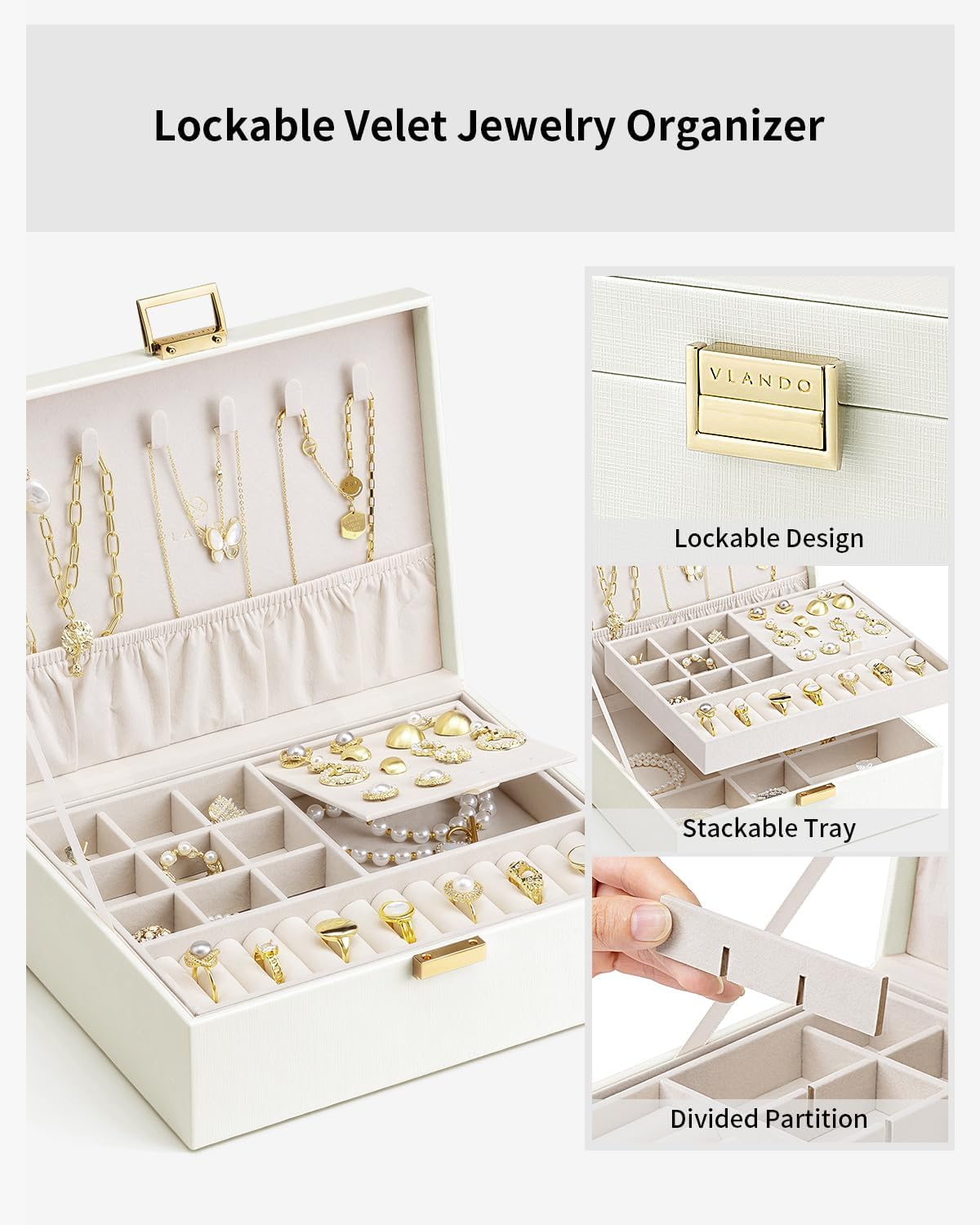 2 Layer Jewelry Storage Box, Teacher Gifts, Large Jewelry Organizer for Women Removable Jewelery Tray for Necklace Earrings Rings Bracelets (Cream White)