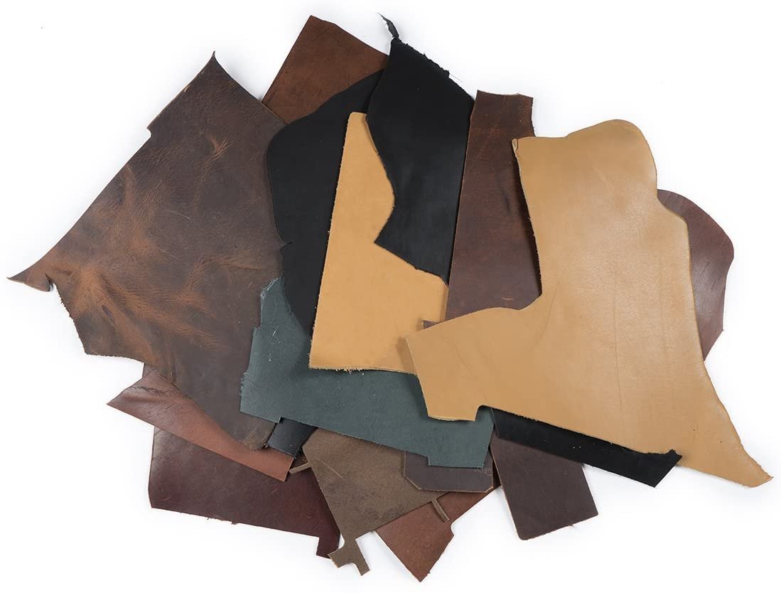 2 lb box of leather remnants. Box contains an assortment of colors. Color options are Dark Drown, Saddle, Black, Buckskin, Stone and Charcoal (and a few other earth tone colors)