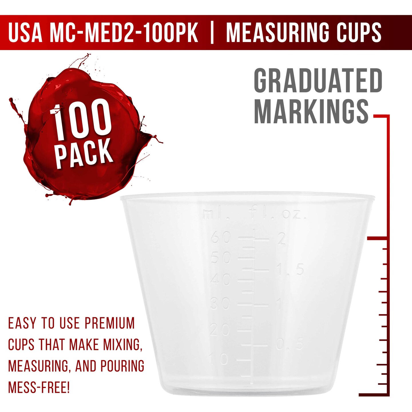2 Oz (60 ml) Liquid Measuring Cups - Plastic Graduated Cup (100 Pack) with 25 Sticks - Reusable Mixing Cups for Paint, Craft, Kitchen, Lab, Medical Supplies, Epoxy Resin, Art