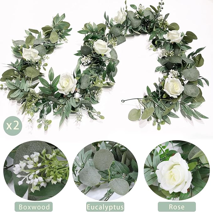 2 Pack 13Ft Artificial Eucalyptus Flower Garland with White Roses, Fake Rose Flower Greenery Garland Floral Vines for Wedding Home Party Table Runner Decor (White)