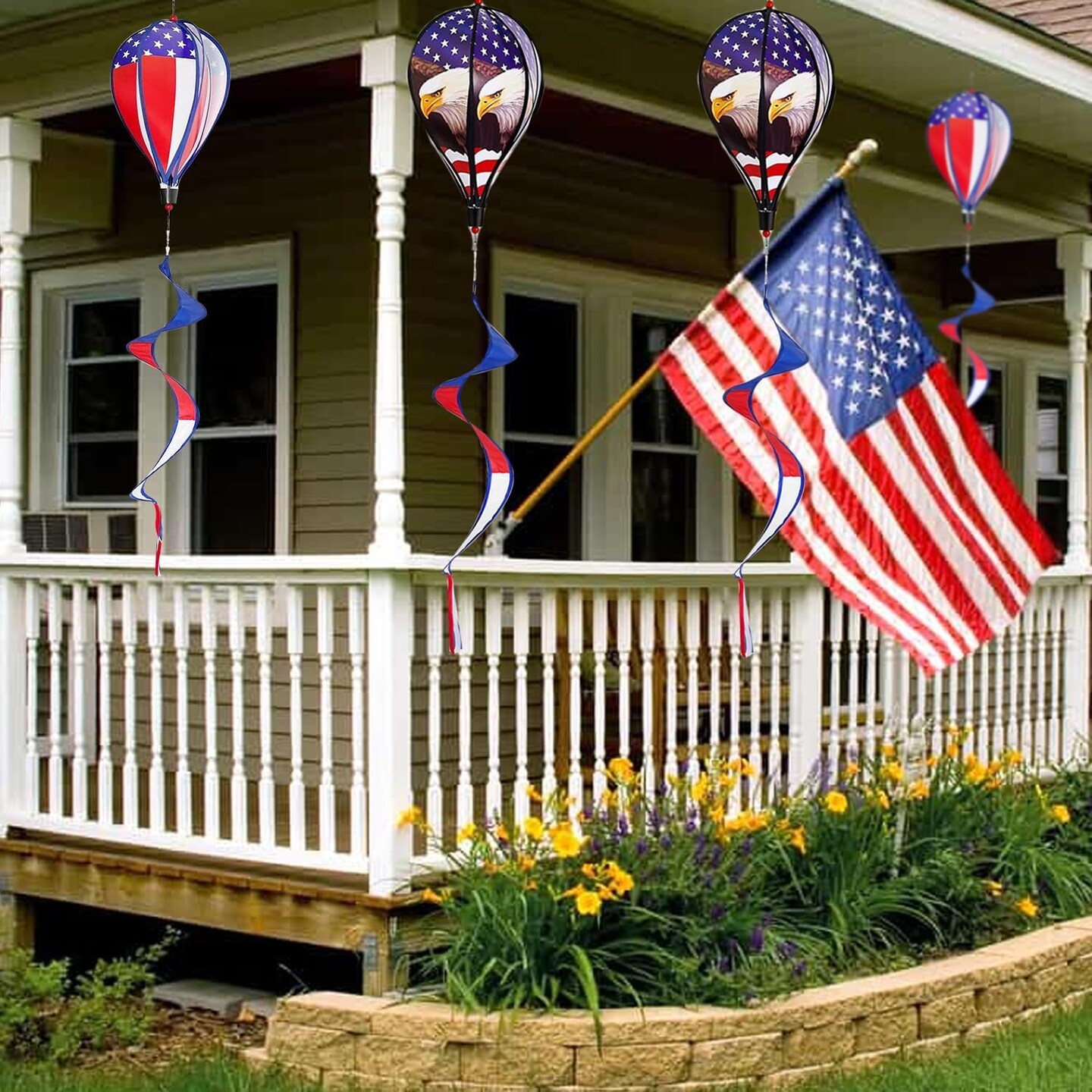 2 Pack 43-Inch Patriotic American Flag & Eagle Hot Air Balloon Wind Spinner Twister, Outdoor Hanging Windmill Decor for Garden Lawn Yard, Fourth of July