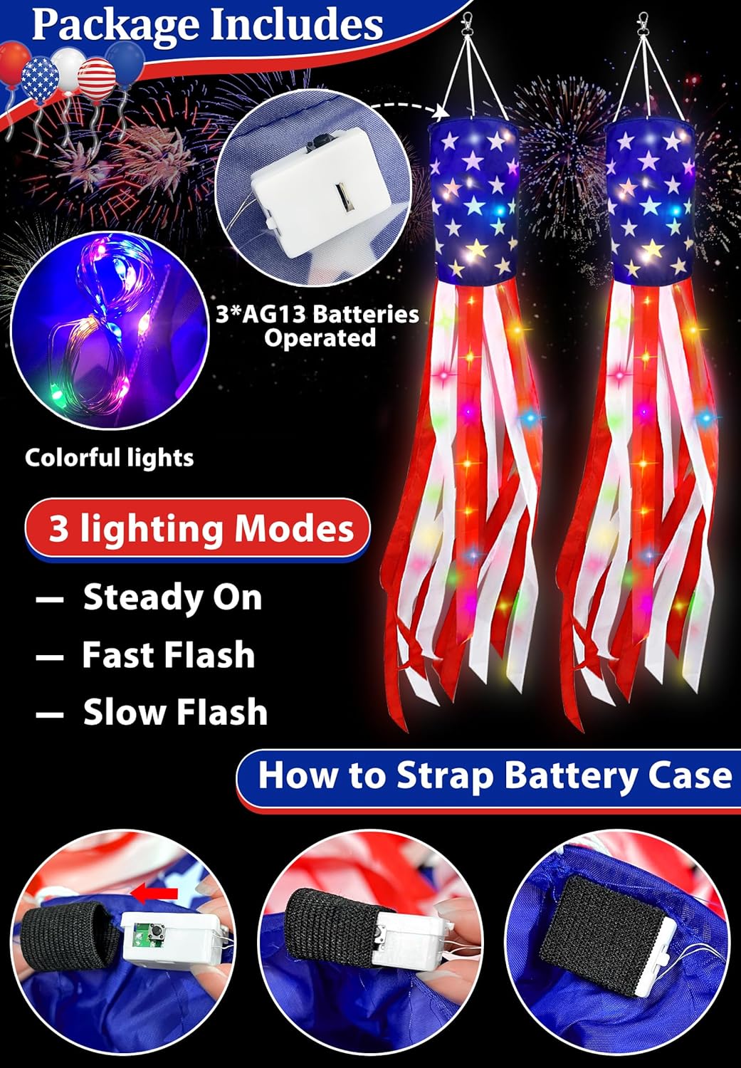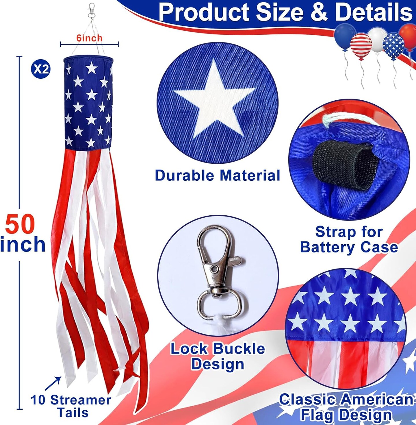 2 Pack 50 Inch Large American Flag Windsock with Lights 4th of July Decorations, Patriotic Fourth of July Outdoor Decor, Red White Blue Star Stripes Hanging Decorations Memorial Day Independence Day