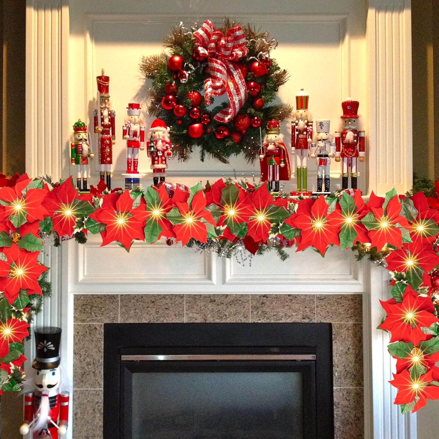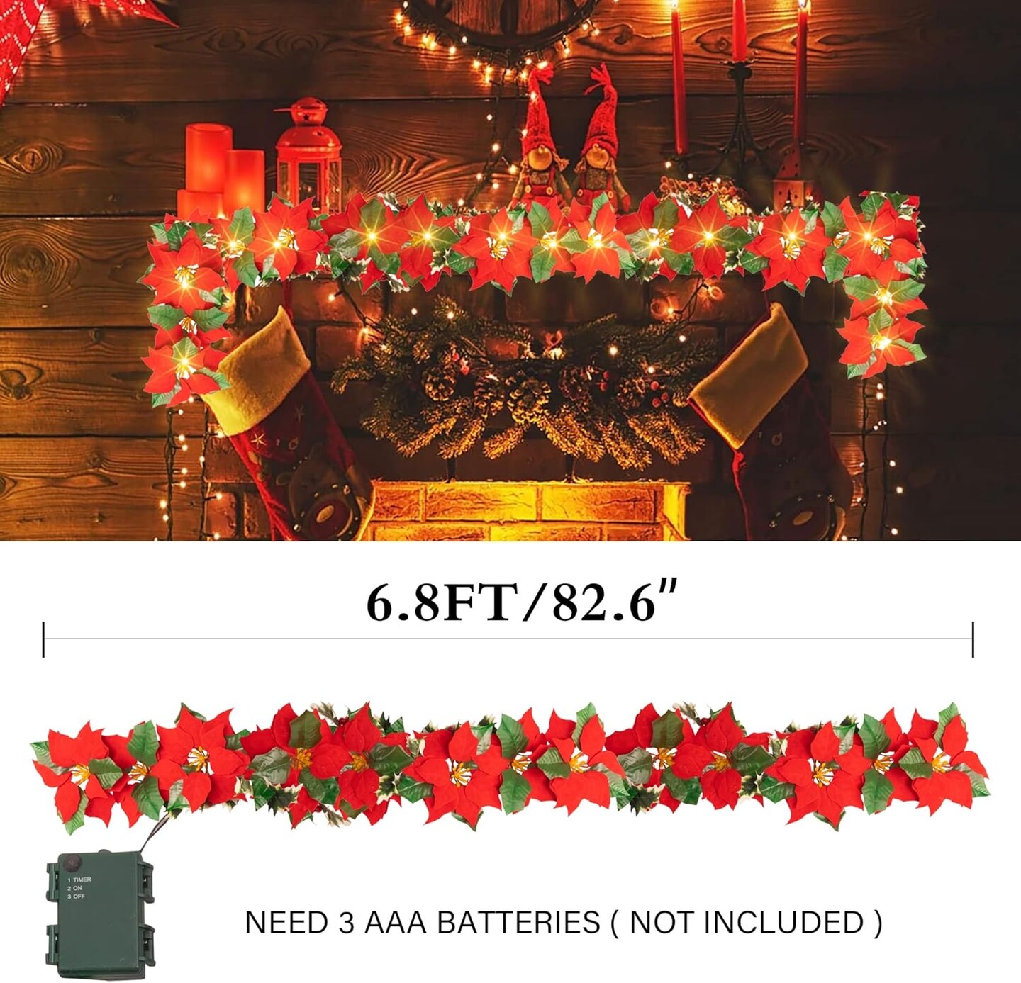 2 Pack 7 FT Christmas Poinsettia Flowers Garland Decorations, 10 LED Lighted Artificial Velvet String Lights with Red Berries, Xmas Ornaments for Indoor Outdoor Fireplace Decor