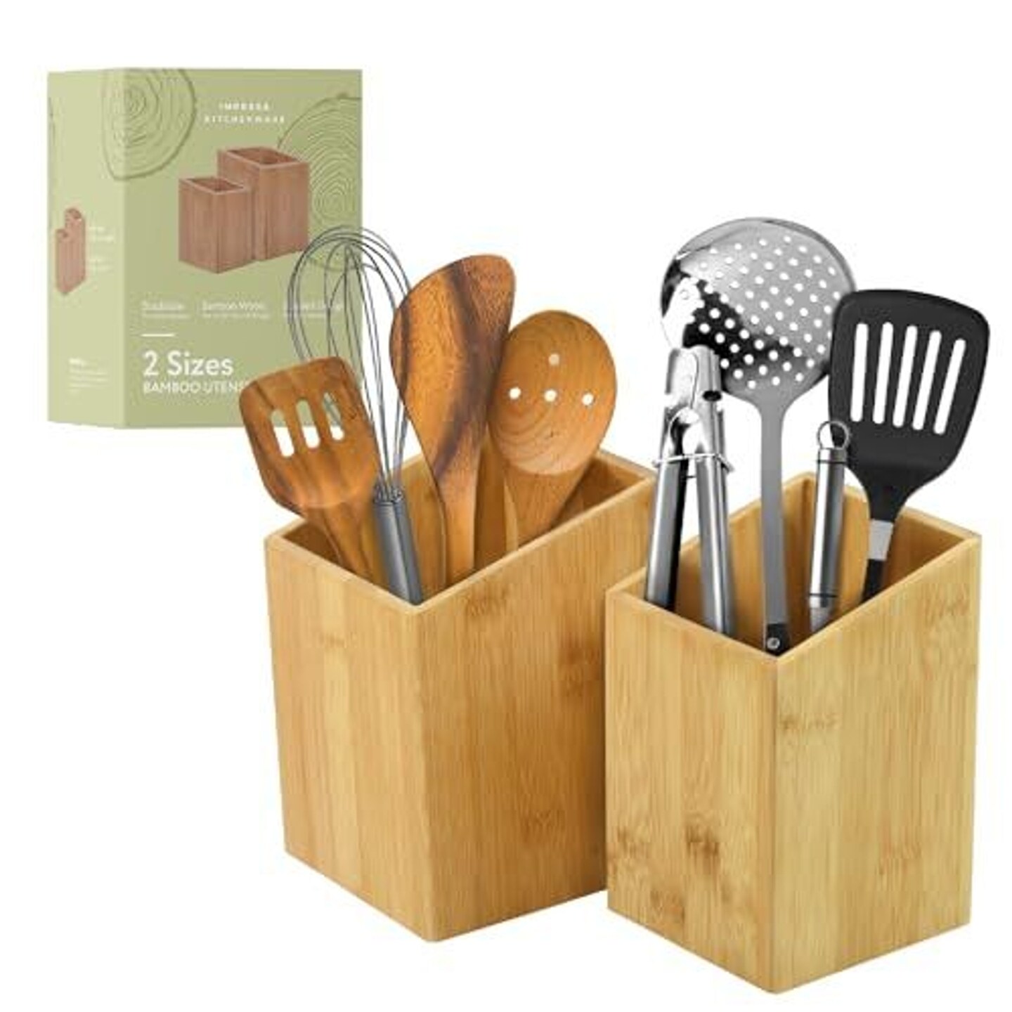 [2 Pack] Bamboo Utensil Holder for Clutter-Free Kitchen – Stylish Kitchen Utensil Crock for Elegant Display and Storage –Wooden Utensil Holder Set for Countertop – Bamboo Kitchen Accessories
