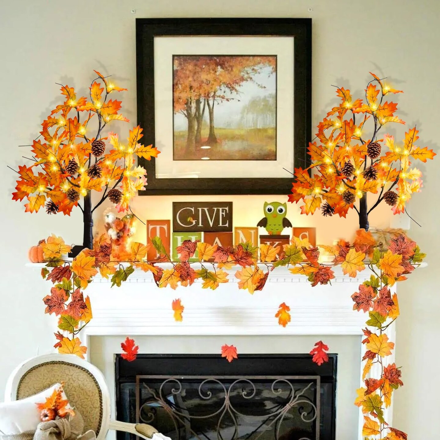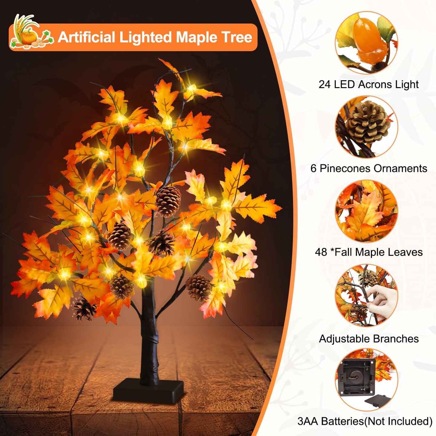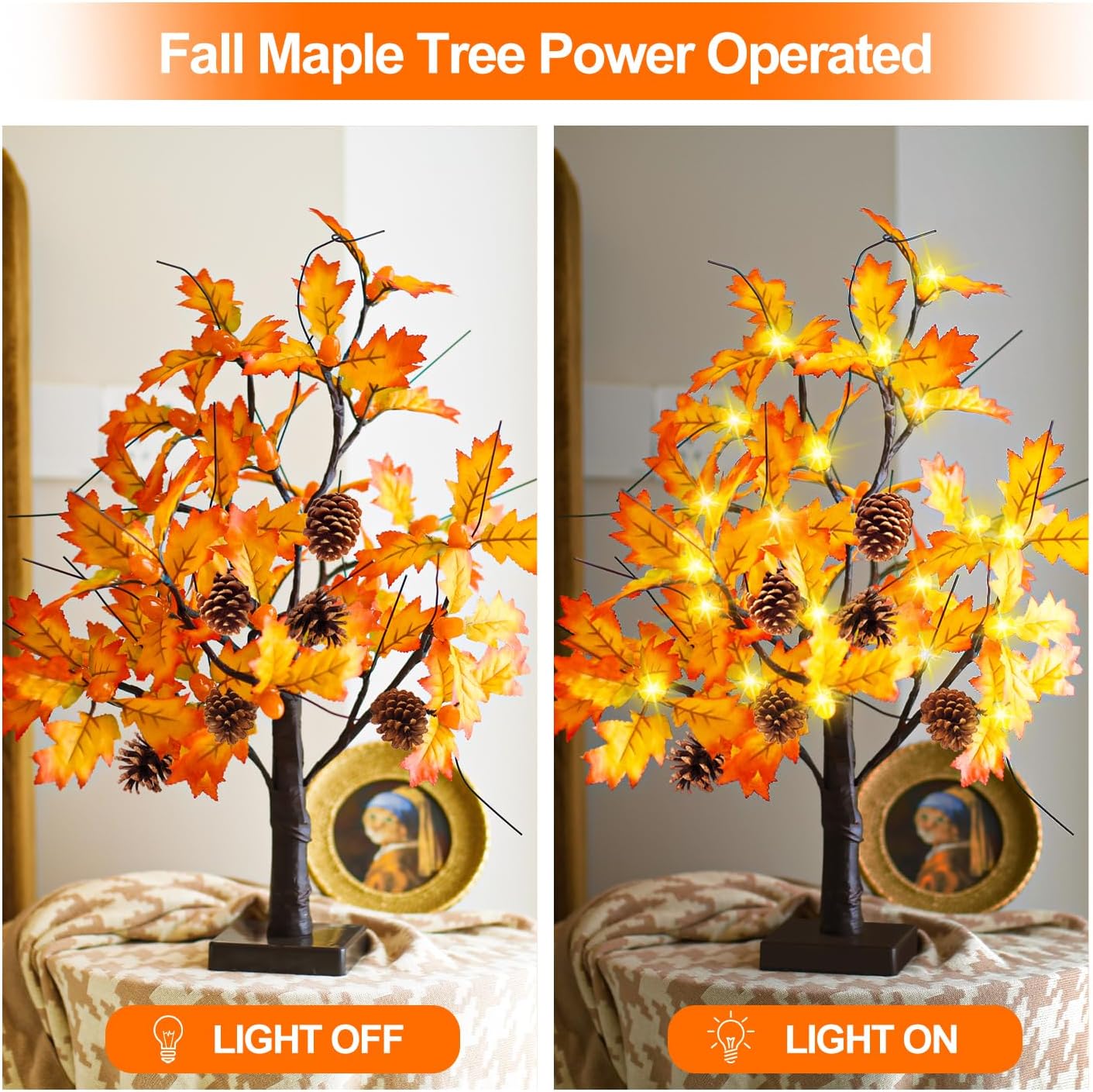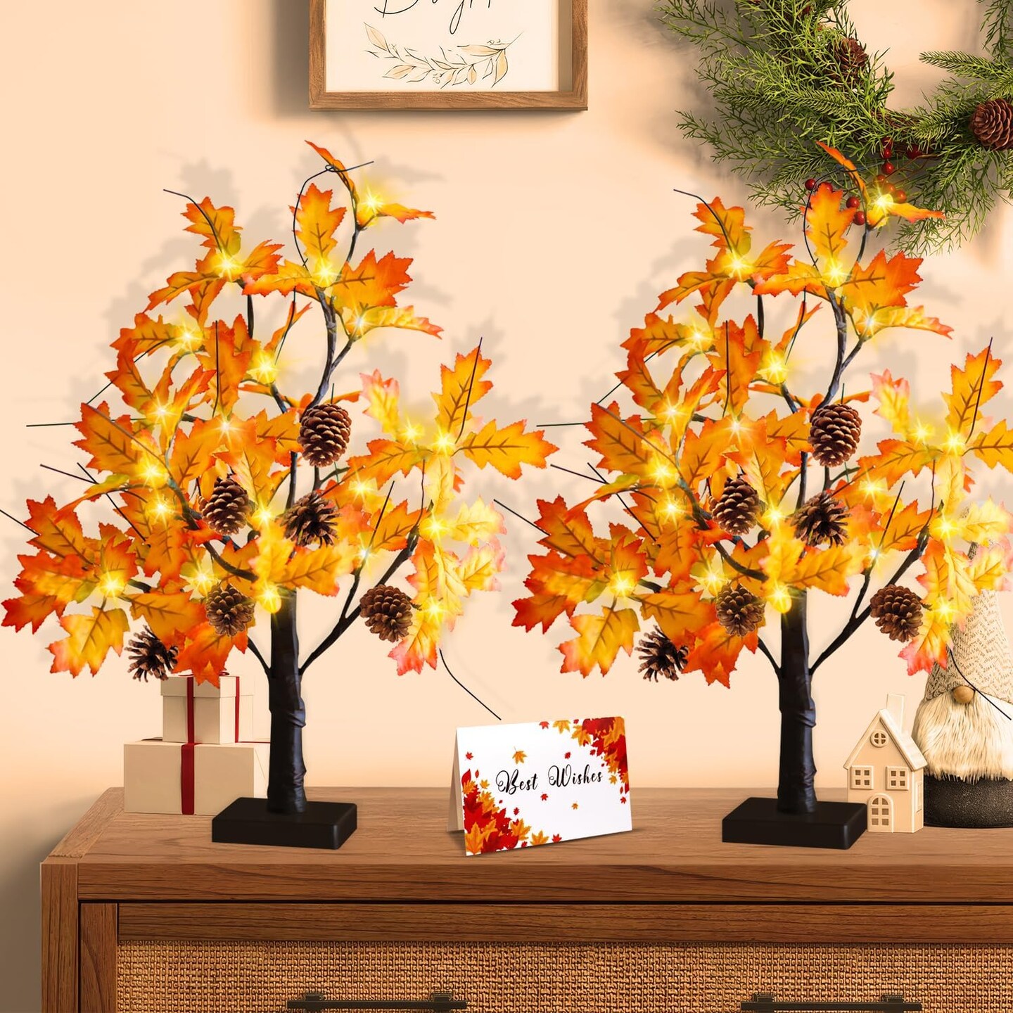 2 Pack Fall Lighted Maple Tree Tabletop - 24 Acorns LED Lights with 6 Pine Cones